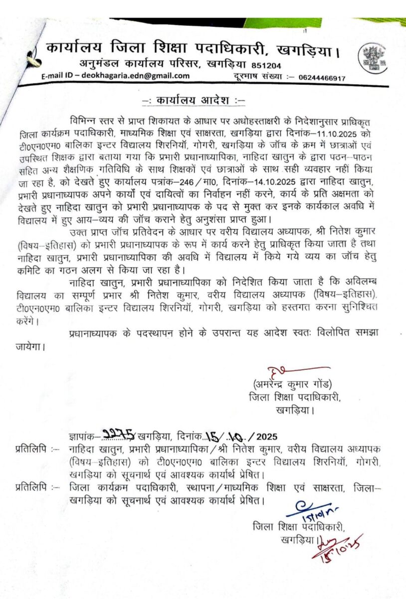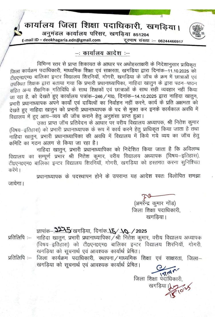गोगरी. प्रखंड स्थित शिरनियां के टीएनएम बालिका इंटर उच्च विद्यालय में कक्षा संचालन के दौरान सो रही एचएम नाहिदा खातून को हटाकर वरीय शिक्षक नीतेश कुमार को प्रभारी प्रधानाध्यापक बनाया गया है. यह कार्रवाई जिला शिक्षा पदाधिकारी ने की है. बता दें कि बीते 16 जुलाई को ड्यूटी के दौरान वर्ग कक्ष में सो रही प्रधानाध्यापिका का वीडियो वायरल शीर्षक से खबर प्रमुखता से प्रभात खबर ने प्रकाशित किया था. जिसमें छात्र और शिक्षक के साथ उनके द्वारा अमर्यादित व्यवहार किये जाने का भी आरोप लगाया गया था. जिसको लेकर जांच कर जिला शिक्षा पदाधिकारी ने प्रधानाध्यापिका नाहिदा खातून को हटाने का आदेश दिया. इसकी जानकारी मिलते ही क्षेत्र के लोगों सहित विद्यालय के बच्चों और शिक्षक के बीच खुशी की लहर दौड़ पड़ी.