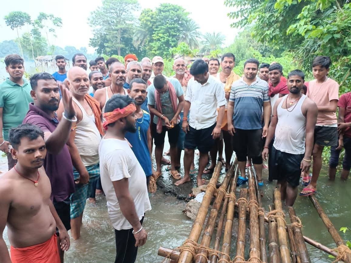 परबत्ता. प्रखंड में तीसरी बार बाढ ने तबाही मचा दी है. बाढ़ का पानी दर्जनों घरों घुस चुका है. इधर माधवपुर पंचायत पूर्ण रूप एक बार फिर बाढ़ से प्रभावित हो चुका है. साथ ही माधवपुर की तरफ जाने वाले सभी रास्तों पर पानी का बहाव काफी तेज है. बीते शनिवार को इस तेज बहाव में एक मोटरसाइकिल बह चुका था. ग्रामीणों के सहयोग से मोटरसाइकिल को किसी तरह पानी से ऊपर किया गया. इस बीच लोगों के सहयोग से चचरी का पुल बनाया गया जो पैदल चलने लायक है. इस कार्य में कमलेश सिंह, धर्मेंद्र सिंह, अनुपम अंश झा, हास्य कलाकार गुलशन, प्रिंस, अंकित, प्रांशु, अंजनी झा, लालू यादव, मोनू , गंगाधर यादव, ललन शर्मा , सुनील झा, दीपक झा आदि ग्रामीण का सहयोग रहा. पंचायत के मुखिया आशुतोष कुमार सिंह ने इस कार्य के लिए ग्रामीणों का सराहना किया. बताते चलें कि भारी बारिश के बीच गंगा नदी के जलस्तर में तीसरी बार वृद्धि से सौढ उत्तरी, सौढ दक्षिणी, भरसो ,कुल्हडिया, लगार, तेमथा करारी जोरावरपुर, दरियापुर भेलवा, माधवपुर, कबेला पंचायत के बाढ़ प्रभावित वार्डों में पानी घुस चुका है.