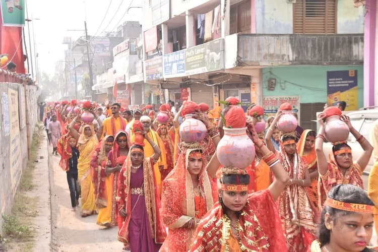 खगड़िया. नगर परिषद के सन्हौली स्थित श्री रामजानकी ठाकुरबाड़ी में श्री श्री 108 विष्णु महायज्ञ सह श्रीमद्भागवत यज्ञ को लेकर सोमवार को कलश शोभायात्रा निकाली गयी. श्री शिव शक्ति योगपीठ नवगछिया के पीठाधीश्वर श्री रामचंद्राचार्य परमहंस स्वामी आगमानंद के सानिध्य में रामजानकी ठाकुरबाड़ी सन्हौली में यज्ञ शुरू हुई. प्रथम चरण में कलश शोभायात्रा यज्ञ से प्रारंभ होकर सन्हौली दुर्गा मंदिर पहुंचा. जहां वैदिक मंत्रोच्चारण के साथ कलश में जल भरकर नगर परिषद के विभिन्न मार्ग से गुजरते हुए यज्ञ स्थल पर पहुंचा. कलश शोभायात्रा में कन्याओं व महिलाओं ने भाग लिया. गाजे बाजे के साथ निकली कलश शोभायात्रा की सेवा भाव में लोग लगे हुए थे. कलश शोभायात्रा में हजारों की संख्या में भक्त जन साथ चल रहे थे. उत्तर चरण में यज्ञ मंडप पर श्री शिव शक्ति योगपीठ नवगछिया के विद्वान पंडित व आचार्य द्वारा पंचाग पूजन, वैदिक पूजन के साथ अग्नि प्रज्ज्वलित कर यज्ञ की शुरुआत की गयी. साथ ही संध्या में नगर सभापति अर्चना कुमारी, वार्ड पार्षद सरिता पासवान, जिप सदस्या प्रिय दर्शना सिंह, वार्ड पार्षद पप्पू यादव, योग पीठ से जुड़े कुंदन बाबा, मानवानंद, डॉ जोतिन्द्र चौधरी, कविवर राजकुमार द्वारा संयुक्त रूस से दीप प्रज्ज्वलित कर धर्म मंच का उद्घाटन किया गया. उद्घाटन पूर्व पंडितों के स्वस्ति वाचन एवं मंच पर उपस्थित लोगों को अंगवस्त्र देकर सम्मानित किया गया. महायज्ञ को लेकर खगड़िया शहर में भक्ति का माहौल बना हुआ है. संगीत कलाकार माधवानंद, बलबीर, कुंदन, पवन, राजू, गुलशन द्वारा संगीत की धारा बह रही है. कार्य व्यवस्था के संचालन को लेकर शिक्षक नेता मनीष कुमार आदि लगे रहे.
