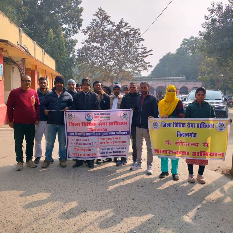 किशनगंज महिला एवं बाल विकास मंत्रालय की ओर से एक सौ दिवसीय बाल विवाह मुक्त भारत जागरूकता अभियान चलाया जा रहे है. इसी क्रम में सोमवार को जिला विधिक सेवा प्राधिकार के सचिव ओम शंकर की अध्यक्षता में जागरूकता अभियान चलाया गया. उक्त जागरूकता अभियान में पैनल अधिवक्ता, जिला विधिक सेवा प्राधिकार के कर्मचारी, पारा विधिक स्वंय सेवक एवं आम नागरिक इत्यादि शामिल थे. जिला विधिक सेवा प्राधिकार के सचिव ओम शंकर ने बताया कि विवाह मुक्त भारत जागरूकता का उद्देश्य बाल विवाह के प्रति जागरूकता बढ़ाना और इसके दुष्प्रभावों के बारे में लोगों को शिक्षित करना है. बाल विवाह को रोकने के लिए सामूहिक प्रयास करने से इसमें सफलता मिलेगी. इसमें जागरूकता शिविर आयोजित करना, ग्रामीण क्षेत्रों में जागरूकता अभियान चलाना और स्कूलों में बच्चों को बाल विवाह के दुष्प्रभावों के बारे में शिक्षित करना शामिल है. इस अभियान के माध्यम से जिला विधिक सेवा प्राधिकार बाल विवाह को रोकने और बच्चों के अधिकारों की रक्षा करने के लिए प्रतिबद्ध है.