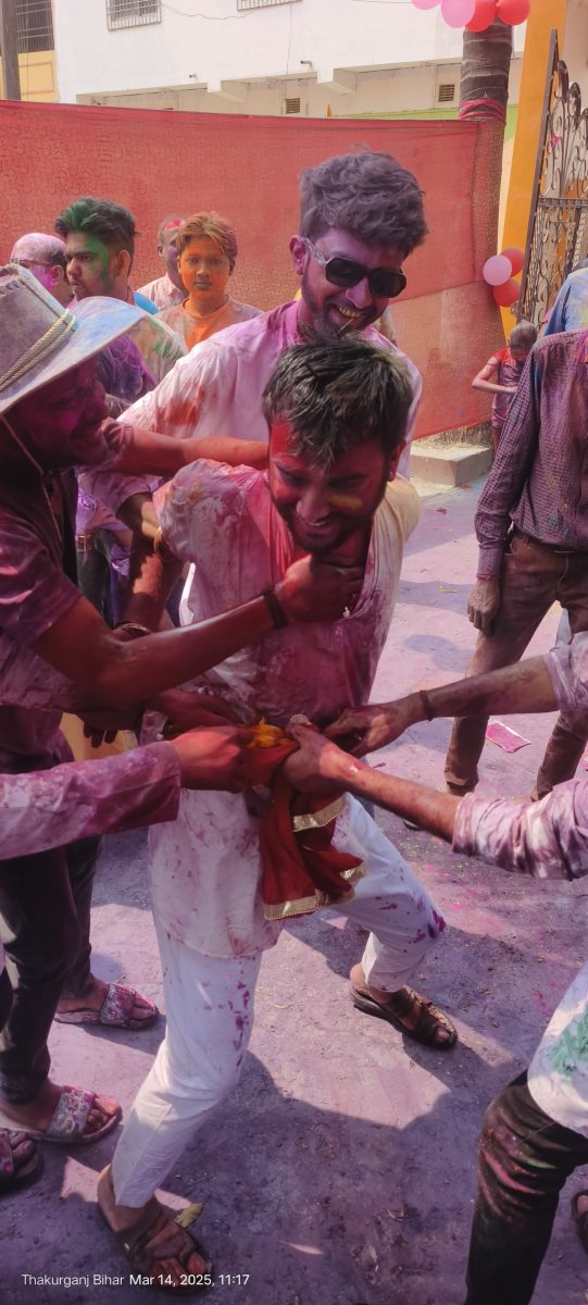 ठाकुरगंज. रंगों का त्योहार होली बड़े ही धूमधाम से शुक्रवार को मनाया गया. इस त्योहार पर शहर, नुक्कड़ और गली में बुरा न मानो होली है की गुंज सुनाई देती रही. सभी लोग टोलियां बनाकर सड़कों पर रंग लेकर एक दूसरे को रंगते नजर आते हैं. इसके साथ ही ढोल की धुनों और तेज संगीत पर नाचते लोग अपने तरीके से ही होली का जश्न मनाते नजर आए. होली पर क्या बच्चे और जवान सभी एक ही रंग में नजर आ रहे थे. भाईचारे के प्रतीक होली पर गिले-शिकवे भुलाकर लोगों ने एक-दूसरे को गुलाल लगाकर अपनी खुशी का इजहार किया. कहीं लोग मीठे पकवानों का आनंद उठा रहे थे, तो कहीं पर पानी की बौछारें सर्दी जाने और गर्मी के आने का संकेत दे रही थी.