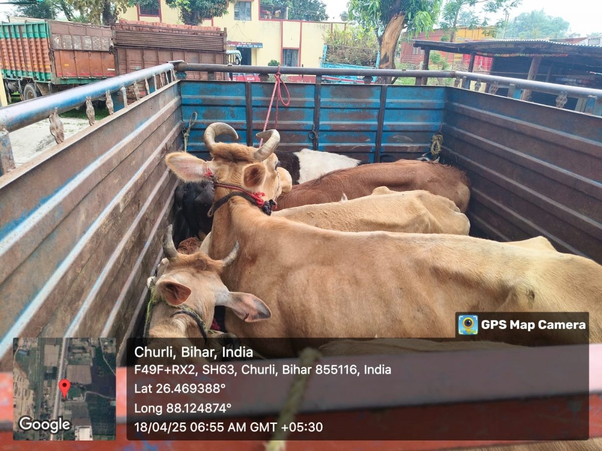 ठाकुरगंज. एनएच 327 ई पर कार्रवाई करते हुए कुर्लीकोट पुलिस ने तस्करी के आठ मवेशियों से लदे पिकअप के साथ चालक को दबोचा है. थानाध्यक्ष सिर्द्राथ कुमार ने बताया कि शुक्रवार की देर रात्रि समय जब थाने के समीप पुलिस बल संग वाहनों की जांच कर रहे थे, तभी कुर्लीकोट थाने से कुछ दूरी पर तेज गति से आ रही पिकअप वाहन पुलिस बल को देखकर भागने की चेष्टा करने लगी. उसके बाद पुलिस टीम द्वारा उक्त पिकअप वाहन का पीछा करके तलाशी ली गई तो उसमें आठ मवेशी लदे मिले. वाहन में बैठे चालक मो अशफाक (35) कुर्लीकोट थानाक्षेत्र निवासी से मवेशी संबंधित कागजात की मांग करने पर कोई कागजात नही दिखा पाया जिसके बाद मवेशी लदे वाहन को जब्त करते हुए चालक को गिरफ्तार किया गया है. पशू क्रूरता अधिनियम के तहत मामला दर्ज करके पुलिस अग्रिम कार्रवाई में जुटी हुई है.
