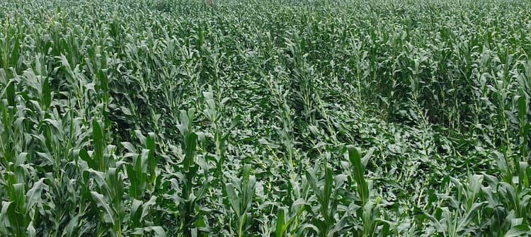 खेतों में लगे लंबे मकई के पौधे तेज हवा का दबाव सह नहीं सके और बड़ी संख्या में जमीन पर गिर गए.