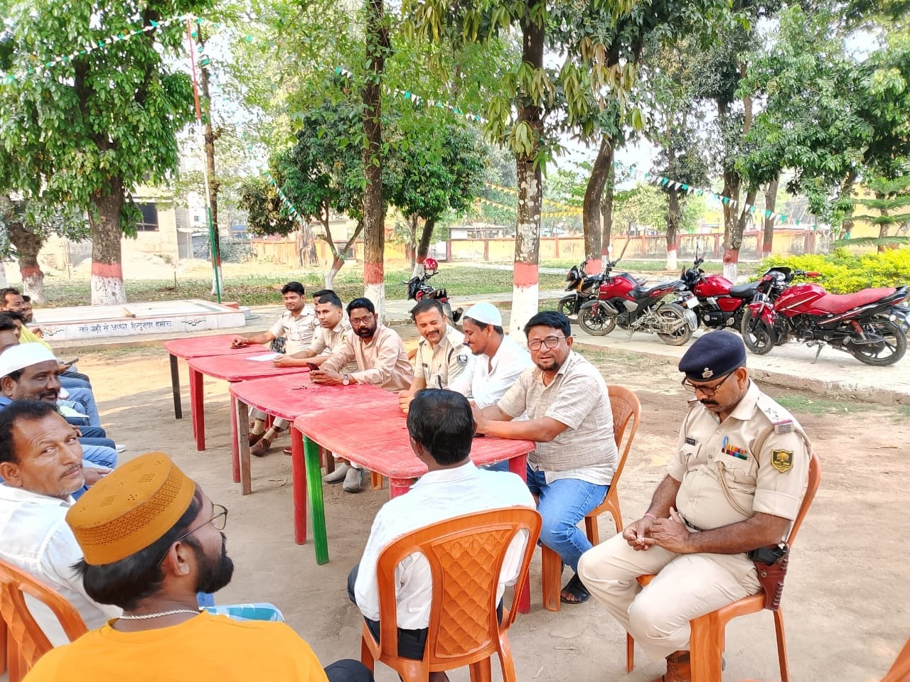 पोठिया. ईद व रामनवमी पर्व के लेकर पोठिया थाना परिसर में बुधवार को थानाध्यक्ष इंस्पेक्टर अंजय अमन की अध्य क्षता में शांति समिति की बैठक आयोजित की गई. इसमें स्थानीय जनप्रतिनिधि, गणमान्य नागरिक, पुलिस प्रशासन और एसएसबी के अधिकारी उपस्थित रहे. बैठक में शांति और सौहार्दपूर्ण माहौल में ईद और रामनवमी जैसे पर्व मनाने को लेकर चर्चा की गई. थानाध्यक्ष ने कहा कि ईद और रामनवमी भाइचारे का पर्व है, इसे आपसी प्रेम और शांति के साथ मनाना चाहिए. थानाध्यक्ष ने बैठक में मौजूद सभी गणमान्य लोगों से प्रशासन का सहयोग करने तथा किसी भी अप्रिय स्थिति में तुरंत पुलिस को सूचित करने की अपील की. कहा कि अशांति फैलाने वाले तत्वों पर पुलिस की नजर रहेगी. सभी ने ईद व रामनवमी पर्व को सौहार्दपूर्ण माहौल में मनाने की बात कही और प्रशासन को सहयोग का भरोसा दिलाया. इस अवसर पर थानाध्यक्ष इंस्पेक्टर अंजय अमन, अपर थानाध्यक्ष विपिन कुमार, एसआई प्रदीप कुमार, सुजीत कुमार, अखिलेश कुमार, प्रखंड प्रमुख शाद मुबारक अली, पूर्व प्रमुख मो जाकिर हुसैन, भाजपा मंडल अध्यक्ष मनोज अग्रवाल, जदयू प्रखंड अध्यक्ष जलाल कादरी, तारिक अनवर, मुखिया नईमुल हुक, बुधरा उपमुखिया प्रतिनिधि शिवनाथ पासवान,मुखिया मुमताज आलम सहित दर्जनों लोग मौजूद थे.