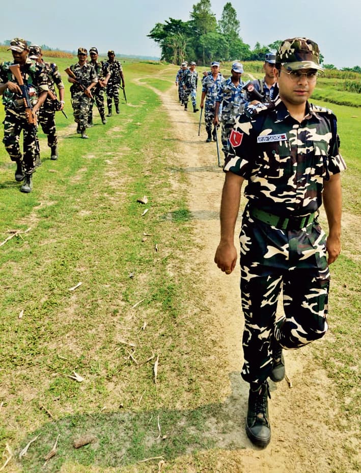 दिघलबैंक (किशनगंज).सीमा पर असामाजिक गतिविधि व तस्करी की रोकथाम को लेकर सोमवार को एसएसबी 12 वीं वाहिनी की ई कंपनी मुख्यालय सिंघीमारी के एसएसबी अधिकारी व जवानों ने पड़ोसी मित्र राष्ट्र नेपाल के एपीएफ जवानों के साथ सीमा पर संयुक्त पेट्रोलिंग की. दोनों देश के अधिकारियों ने भारत नेपाल बॉडर पिलर संख्या 141 से 143/03 तक करीब पांच किलोमीटर पैदल मार्च किया.साथ ही सीमा पर स्थित बॉडर पिलर की सुरक्षा एवं सीमा पर बढ़ रहे अतिक्रमण और सीमावर्ती क्षेत्र से होने वाले घुसपैठ को रोकने के लिए दोनों देश के अधिकारी ने पेट्रोलिंग किया.दोनों देश के अधिकारियो ने आपस में अपनी बेहतर तालमेल पर बल दिया. वहीं नेपाली एपीएफ के अधिकारी ने बताया कि सुरक्षा के दृष्टिकोण से वह सीमा पर हर संभव सहयोग करने को तैयार है. इस पेट्रोलिंग का नेतृत्व असिस्टेंट कमांडेंट आयुष दाधीच ने की. इस पेट्रोलिंग में नेपाल के एपीएफ व एसएसबी के दर्जनों जवान शामिल थे.