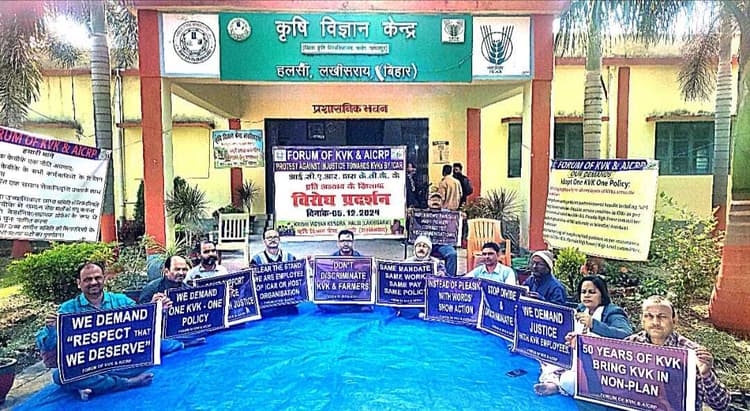 हलसी. स्थानीय कृषि विज्ञान केंद्र हलसी के प्रांगण में गुरुवार को केंद्र के वैज्ञानिकों व कर्मियों ने कृषि विज्ञान केंद्र एम्पलाई एसोसिएशन के अध्यक्ष डॉ नित्यानंद एवं सचिव डॉ विनोद कुमार के आह्वान पर एक दिवसीय कलमबंद धरना-प्रदर्शन किया गया. मौके पर मौजूद कृषि वैज्ञानिकों ने कहा कि गैर आईसीएआर कृषि विज्ञान केंद्र के प्रति पक्षपातपूर्ण रवैया के खिलाफ विरोध-प्रदर्शन भी किया गया. हलसी केवीके के प्रधान वैज्ञानिक डॉ शंभू राय ने बताया कि उनके संगठन की मुख्य मांगों से देश भर के केवीके के सभी वैज्ञानिकों एवं कर्मचारियों के लिए वेतन समानता लाना, एनपीएस सहित एक समान सेवानिवृत्ति उपरांत के लाभ लागू करना, आरएस परौदा उच्चस्तरीय अधिकार प्राप्त समिति की सिफारिश के अनुसार केवीके में समान सेवा शर्तों को लागू करना, एसएमएस को वैज्ञानिक, सहायक प्रोफेसर के रूप में समान रूप से पुनः नामित करना, आरएस परौदा उच्चस्तरीय समिति की सिफारिश के अनुसार कर्मचारी स्टाफ पदों का पुनर्गठन करना है. वहीं मौके पर कृषि विज्ञान केंद्र के प्रधान वैज्ञानिक डॉ शंभू राय, डा सुधीर चंद्र चौधरी, डॉ विनोद कुमार सिंह, डॉ सुनील कुमार सिंह, डॉ रेणु कुमारी, डॉ निशांत प्रकाश, अश्विनी कांत, विजय कुमार सिंह, द्रवीन कुमार सिंह, देवनाथ पासवान एवं शशि प्रकाश अन्य लोगों उपस्थित रहे.——————————————————————————–