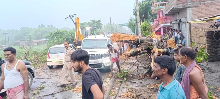 बड़हिया. प्रखंड में बुधवार की देर रात हुई भारी बारिश की वजह से रामनगर स्थित गैस गोदाम के समीप मुख्य सड़क एनएच 80 पर विशालकाय वट का पेड़ गिर गया. जिससे आवागमन बाधित हो गया है. गनीमत रही कि जिस समय पेड़ गिरा उस समय सड़क पर कोई वाहन नहीं था. अन्यथा बड़ा हादसा हो सकता था. सड़क पर पेड़ गिरने से दोनों ओर जाम में वाहन फंस गये. देखते ही देखते वाहनों की लंबी कतार लग गयी. जाम में फंसे वाहन चालकों के द्वारा सूचना पुलिस को दी गयी. मौके पर पहुंची बड़हिया पुलिस ने नगर परिषद बड़हिया से जेसीबी मशीन मंगवाकर सड़क किनारे गिरे पेड़ को हटवाया. पेड़ गिरने से बिजली के लाइन भी क्षतिग्रस्त हुई है. जिससे नगर एवं ग्रामीण क्षेत्रों की बिजली गुल हो गयी. दोपहर बाद विद्युत विभाग आपूर्ति बहाल कराया सका.