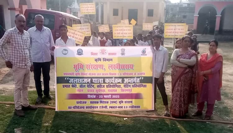 सूर्यगढ़ा. प्रखंड के किरणपुर पंचायत में मध्य विद्यालय ऋषि पहाड़पुर के स्कूली बच्चों द्वारा जलछाजन यात्रा कार्यक्रम अंतर्गत प्रभात फेरी निकाली गयी. कार्यक्रम का आयोजन कृषि विभाग भूमि संरक्षण प्रधानमंत्री सिंचाई योजना जलछाजन विकास 2.0 परियोजना अंतर्गत किया गया. प्रभात फेरी में पंचायत के मुखिया शैलेंद्र कुमार के अलावा विद्यालय के बच्चे एवं शिक्षक, भूमि संरक्षण कार्यालय लखीसराय से तकनीकी विशेषज्ञ सामाजिक उत्प्रेरक एवं कर्मी उपस्थित रहे. प्रभात फेरी में विद्यालय में पढ़ने वाले लगभग 100 बच्चे हाथों में बैनर एवं तख्ती थामे जंगल बचाओ, जल बचाओ, वर्षा का पानी बचाओ, पेड़ पौधा बचाओ आदि नारे लगा रहे थे. प्रभात फेरी के दौरान स्कूली बच्चों ने विद्यालय के पोषक क्षेत्र का भ्रमण किया.