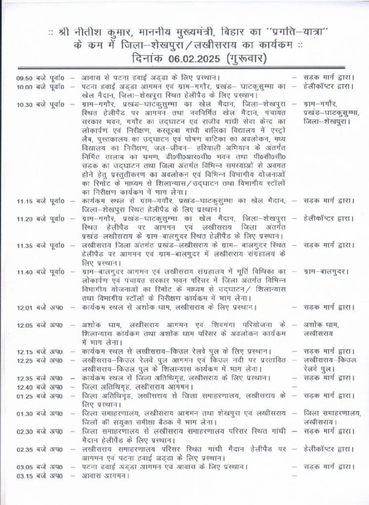 जानकारी के अनुसार, मुख्यमंत्री नीतीश का काफिला दोपहर 12 बजे सबसे पहले लखीसराय के बालगुदर गांव पहुंचेगास, जहां वे म्यूजियम का लोकार्पण और शिवगंगा तालाब का शिलान्यास करेंगे. इसके साथ ही वे पंचायत सरकार भवन का निरीक्षण, खेल मैदान और जल जीवन हरियाली योजना के तहत बने तालाब का उद्घाटन करेंगे. मुख्यमंत्री नीतीश कुमार अलग-अलग विभागों के स्टॉल का जायजा लेने के साथ जीविका दीदियों से संवाद भी करेंगे.