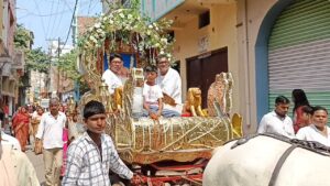श्रद्धालु रथ पर ठाकुर अनुकूलचंद्र के चित्र के साथ श्रद्धालुओं ने किया पूरे नगर में भ्रमण