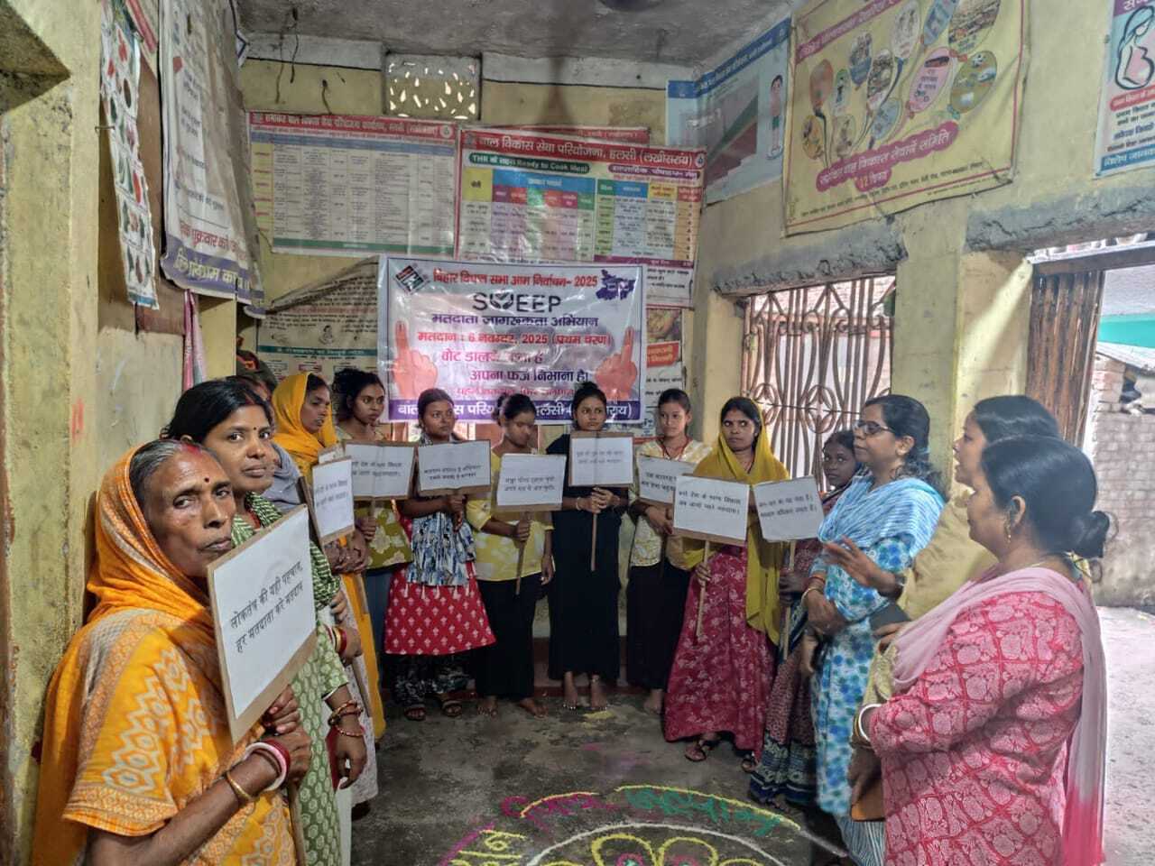 आंगनबाड़ी केंद्रों पर रंगोली बनाकर शत-प्रतिशत मतदान का दिया संदेश हलसी. प्रखंड मुख्यालय अंतर्गत गुरुवार को विस चुनाव में शत-प्रतिशत मतदान सुनिश्चित कराने के उद्देश्य से गुरुवार को प्रखंड के विभिन्न आंगनबाड़ी केंद्रों पर मतदाता जागरूकता कार्यक्रम आयोजित किया. इसकी अध्यक्षता सहायक नोडल पदाधिकारी स्वीप बाल विकास परियोजना पदाधिकारी कुमारी मुक्ता ने की़ बूथ संख्या 379 मध्य विद्यालय पूर्वी भाग, बूथ संख्या 380 पंचायत भवन व महादलित टोला के साथ-साथ नये मतदाताओं से शत-प्रतिशत मतदान करने को लेकर जागरूक किय गया. सहायक नोडल पदाधिकारी स्वीप बाल विकास परियोजना पदाधिकारी कुमारी मुक्ता ने कहा कि पिछली बार मतदान प्रतिशत कम हुआ था, जिसको लेकर जागरूकता अभियान चलाया गया. इस दौरान रंगोली के माध्यम से शत-प्रतिशत मतदान का संदेश देकर लोगों को जागरूक किया गया. आंगनबाड़ी केंद्रों पर सेविका व सहायिका ने बच्चों व उनके अभिभावकों के साथ मिलकर रंग-बिरंगी रंगोली बनायी. कार्यक्रम में महिला पर्यवेक्षक रीना कुमारी, शर्मिला, ममता व सेविका प्रतिमा साव, गीता देवी, पूनम कुमारी, मंजू देवी एवं अन्य ग्रामीण मौजूद रहे.