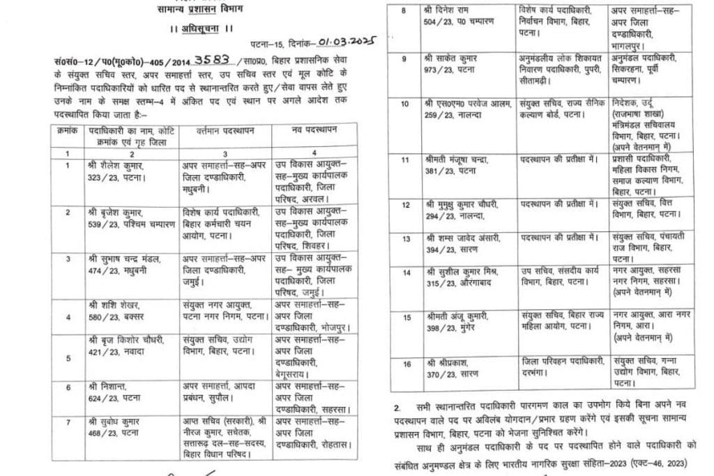 Bihar: आज किये गए तबादले में राज्य सरकार ने बिहार प्रशासनिक सेवा के संयुक्त सचिव स्तर, अपर समाहर्ता स्तर और उपसचिव स्तर के 16 अधिकारियों को शामिल किया है.
