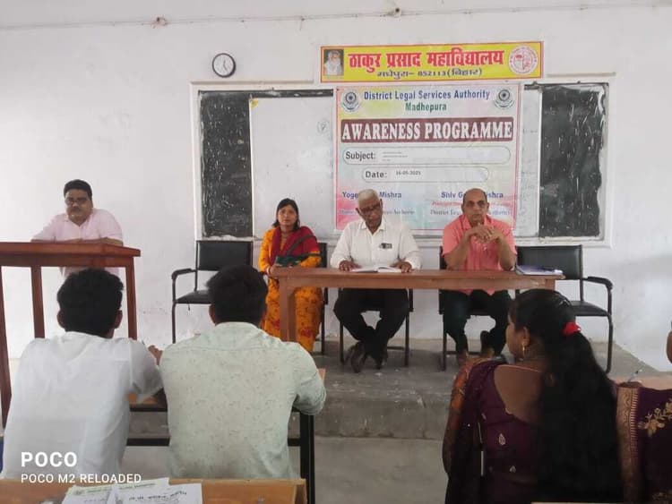मधेपुरा. जिला विधिक सेवा प्राधिकार की ओर से विधिक सेवाएं योजना 2015 के तहत शनिवार को ठाकुर प्रसाद महाविद्यालय मधेपुरा परिसर में नशा उन्मूलन को लेकर जागरूकता कार्यक्रम आयोजित किया गया. कार्यक्रम का उद्देश्य युवाओं को नशे के दुष्प्रभावों से अवगत कराना व उन्हें उपलब्ध विधिक सहायता के बारे में जागरूक करना था. महाविद्यालय के प्राचार्य प्रो कैलाश प्रसाद यादव ने कहा कि नशा न केवल शिक्षा बल्कि जीवन की दिशा को भी नष्ट कर देता है. युवाओं को चाहिए कि वह अपने भविष्य की चिंता करते हुए ऐसे प्रलोभनों से दूर रहें. दर्शनशास्त्र विभाग के विभागाध्यक्ष डाॅ सुधांशु शेखर ने कहा कि नशा एक मानसिक व सामाजिक रोग है. इसका समाधान केवल कानून से नहीं, बल्कि नैतिक शिक्षा व आत्मचिंतन से भी संभव है. हमें अपने छात्रों को विचारशील व समाजोन्मुख बनाना होगा. कार्यक्रम में अधिवक्ता विजय कुमार ने छात्र-छात्राओं से अपील किया कि वह नशे से दूर रहें और समाज को भी इस दिशा में जागरूक करें. जिला विधिक सेवा प्राधिकार के सचिव योगेश कुमार मिश्र ने कहा कि विधिक सेवा प्राधिकरण द्वारा नशा उन्मूलन के लिए विभिन्न योजनाएं चलायी जा रही है, जिनके अंतर्गत नशा पीड़ितों को विधिक सलाह, पुनर्वास व सहायता उपलब्ध करायी जाती है. आम जनता को इस विषय में जानकारी देने के लिए महाविद्यालय व शिक्षण संस्थानों में निरंतर अभियान चलाया जा रहा है. कार्यक्रम में बड़ी संख्या में छात्र-छात्राएं, शिक्षक-शिक्षिकाएं समेत अन्य उपस्थित रहे.