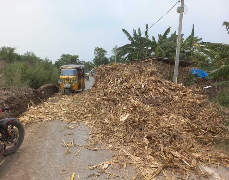 प्रखंड क्षेत्र की मुख्य सड़कों राजपुर सरसंडी गांव के निकट ग्वालपाड़ा से खुरहान सड़क पर मक्का का ठठेरी जमा है. सड़क पर रखा ठठेरी को लेकर वाहन चालकों को परेशानी का सामना करना पड़ रहा है. मकई ठठेरी पर भी फिसलती बाइक सवार चालकों के दुर्घटनाग्रस्त होने की आशंका बढ़ गयी है. यही नहीं, सड़क पर लोगों के द्वारा मकई सुखाया जा रहा था. अब ठठेरी अन्य सामान को भी सड़क पर ही रख रहे हैं. सड़क को जाम कर दिया जा रहा है मकई सूखा रहे किसानों और सड़क पर ठठेरी रख कर के किसानों की मनमानी की तब हद दिखती है जब संपूर्ण सड़क पर ही मकई सुखाने को लेकर कब्जा कर लिया जाता है. गौरतलब है कि राहगीरों को आवागमन में हो रही परेशानी से मकई सुखाने वालों को कोई लेना-देना नहीं है. फिलहाल, कोई कार्यवाही नहीं होने से सड़क पर मक्का सुखाने और ठठेरी रखने वाले किसानों की संख्या बढ़ती जा रही है. एक तरफ बाइक सवार किसानों की इस हरकत से काफी परेशानी है, क्योंकि दस मिनट का रास्ता 30 मिनट में तय करना पड़ता है.उस स्थिति में बाइक सवार को फिसलने का डर हमेशा बना रहता है. किसान बताते हैं कि हमलोगों के पास पर्याप्त जमीन नहीं है. इस वजह से मजबूरन हमलोगों को सड़क पर मकई सुखाना पड़ता है और ठठेरी रखना पड़ता है. साथ ही यह भी बताया कि सड़क गर्म रहने के कारण मक्का एक से दो दिनों में सूखकर तैयार हो जाता है. इन दिनों प्रखंड के विभिन्न ग्रामीण सड़कों पर मक्का किसानों ने ठठेरी रखने का कब्जा व मकई सुखाने को लेकर बरकरार है.