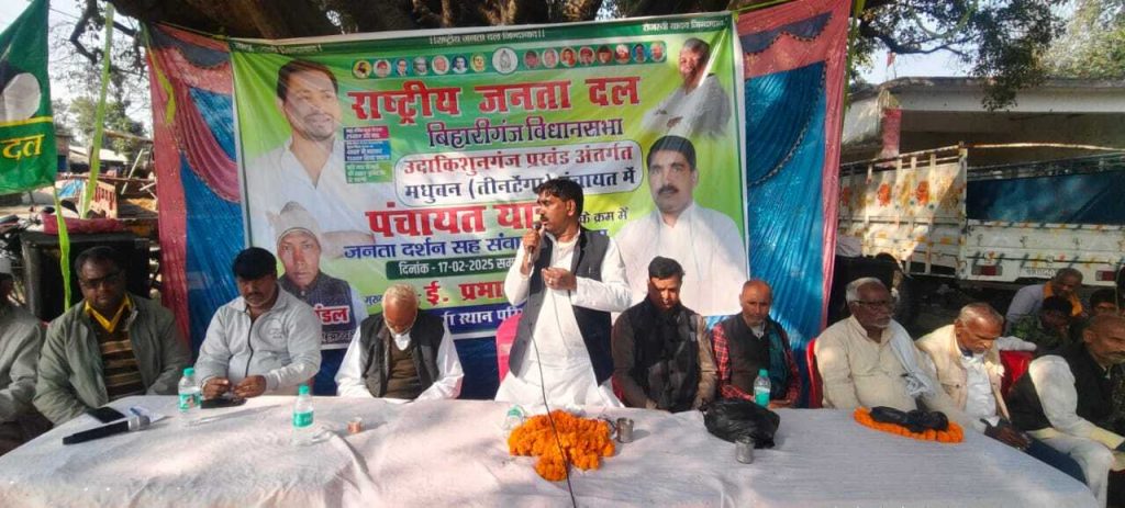 उदाकिशुनगंज . प्रखंड क्षेत्र अंतर्गत मधुबन पंचायत के तीनटंगा दुर्गा मंदिर परिसर के प्रांगण में सोमवार को राजद का एक दिवसीय जनता दर्शन सह संवाद कार्यक्रम का आयोजन किया गया, जिसकी अध्यक्षता राजद पंचायत अध्यक्ष पूरण मंडल व संचालन प्रखंड अध्यक्ष गजेंद्र राम ने किया. मौकेक पर बिहारीगंज विधानसभा के पूर्व राजद प्रत्याशी ई प्रभाष कुमार ने कहा कि बिहारीगंज विधानसभा क्षेत्र के लोगों को विकास की जरूरत है, बिहारीगंज विधानसभा क्षेत्र विकास के मामले में सबसे पिछड़ा हुआ है. इस क्षेत्र में पक्की सड़क, बेहतर स्वास्थ्य व्यवस्था और शिक्षा एवं उद्योग की जरूरत है, लेकिन आज तक इस ओर वर्तमान विधायक या सरकार की ओर से ध्यान नहीं दिया गया. 20 सालों में बिहारीगंज को बदहाल बना दिया है. उन्होंने कहा कि बिहारीगंज के विकास के लिए हमलोगों को अब नेतृत्व बदलने की जरूरत है. बिहार में सरकार बदलने की जरूरत है. बताया कि 2025 में तेजस्वी यादव के नेतृत्व में बिहार में सरकार बनेगी, जिससे बिहार के आम आवाम का चहुमुखी विकास होगा. बिहार में अपराध एवं भ्रष्टाचार चरम सीमा पर है, जिसे सरकार रोकने में पूरी तरह विफल है. उन्होंने कहा कि संपूर्ण वंचित समुदाय को धर्म, पूजा, यज्ञ में उलझा कर उसके अधिकार को छीनने का प्रयास किया जा रहा है. उन्होंने कहा कि एनडीए सरकार में अब तक एक भी प्रतियोगी परीक्षा ऐसा नहीं हुआ, जिसमें पेपर लीक और दूसरी तरह की अनियमितता नहीं हुई हो. सत्ता द्वारा अपराधियों को संरक्षण देने की वजह से बिहार में अपराधियों का तांडव दिन पर दिन बढ़ते ही जा रहा है. मौके पर पूर्व प्रखंड अध्यक्ष मो अयूब, मुखिया प्रतिनिधि प्रीतम मंडल, सीताराम मंडल, प्रखंड उपाध्यक्ष पवन यादव, मो इसराफिल, मुरली मंडल, जिला महासचिव शंकर यादव, छत्री यादव, महेश्वरी, प्रखंड महासचिव विवेक यादव, सुनील यादव, छात्र अध्यक्ष रवि कुमार, श्रवण कुमार, सुमन, मिलन आदि मौजूद थे.