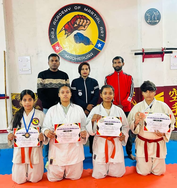 मधेपुरा. खेल विभाग बिहार राज्य खेल प्राधिकरण पटना व जिला प्रशासन पूर्णिया के संयुक्त तत्वावधान में पांच से सात दिसंबर 2025 तक खेल भवन पूर्णिया में आयोजित राज्य स्तरीय (अंतर प्रमंडल) विद्यालय कराटे बालिका प्रतियोगिता में मधेपुरा जिले की बालिका खिलाड़ियों ने कोशी प्रमंडल की ओर से खेलते हुये बेहतरीन प्रदर्शन किया. जिला कराटे संघ के सचिव सह राज एकेडमी ऑफ मार्शल आर्ट की निदेशक सोनी राज बताया कि प्रतियोगिता में काव्या भारती ने अंडर – 17 आयु वर्ग के 52-56 किलो वर्ग में रजत पदक, जबकि सरस्वती ने अंडर – 14 आयु वर्ग के 50 किग्रा भार वर्ग में, शुकृति ने अंडर – 17 आयु वर्ग के 68 किग्रा भार वर्ग में तथा संध्या ने अंडर – 17 आयु वर्ग के 64-68 किग्रा भार वर्ग में कांस्य पदक जीतकर अपने जिला व कोशी प्रमंडल का गौरव बढ़ाया. खिलाड़ियों की उपलब्धि पर उपाधीक्षक शारीरिक शिक्षा आम्रपाली कुमारी, कराटे संघ के संरक्षक मो अशफाक आलम, संघ के अध्यक्ष सावंत कुमार रवि, संघ के सचिव सोनी राज, प्रशिक्षक विजय कुमार, हॉली क्रॉस स्कूल की प्रधानाध्यापिका वंदना कुमारी व गिरजा कपिलदेव इंटर कॉलेज की निदेशिका संगीता कुमारी आदि ने बधाई दी.