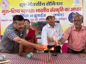 गुरु-शिष्य परंपरा: भारतीय संस्कृति का आधार ” विषय पर एक दिवसीय राष्ट्रीय संगोष्ठी मधेपुरा. भूपेंद्र नारायण मंडल वाणिज्य महाविद्यालय में गुरु पूर्णिमा के अवसर पर “गुरु-शिष्य परंपरा: भारतीय संस्कृति का आधार ” विषय पर सेमिनार का आयोजन गुरुवार को किया गया. यह कार्यक्रम महाविद्यालय परिवार द्वारा भारतीय संस्कृति की समृद्ध परंपराओं को पुनर्स्मरण कराने व आधुनिक शिक्षा प्रणाली में गुरु-शिष्य संबंधों के महत्त्व पर विमर्श के लिए आयोजित किया गया था. कार्यक्रम की अध्यक्षता महाविद्यालय के प्राचार्य डॉ संजीव कुमार ने की. उन्होंने कहा कि गुरु-शिष्य परंपरा न केवल भारत की सांस्कृतिक पहचान है, बल्कि यह हमारी सभ्यता का आधार स्तंभ है. उन्होंने कहा कि “आज जब शिक्षा का स्वरूप तेजी से बदल रहा है और तकनीक हमारे जीवन का अभिन्न अंग बन चुकी है, ऐसे समय में गुरु और शिष्य के मध्य पारंपरिक भावनात्मक, नैतिक व बौद्धिक संबंध को बनाए रखना और भी अधिक आवश्यक हो गया है. गुरु न केवल ज्ञान का स्रोत होता है, बल्कि वह चरित्र, जीवन दृष्टि और सामाजिक उत्तरदायित्व का भी मार्गदर्शन करता है. डॉ कुमार ने प्राचीन भारत की शिक्षा पद्धति का उल्लेख करते हुये तक्षशिला, नालंदा, और विक्रमशिला जैसे विश्वप्रसिद्ध विश्वविद्यालयों की चर्चा की. उन्होंने कहा कि भारत की इस महान परंपरा में गुरु केवल विषय विशेषज्ञ नहीं, अपितु जीवन के संपूर्ण मार्गदर्शक रहे हैं. राम और विश्वामित्र, कृष्ण और संदीपनि, अर्जुन और द्रोणाचार्य, चाणक्य और चंद्रगुप्त जैसे अनेक उदाहरण भारतीय संस्कृति में गुरु-शिष्य संबंधों की अमर गाथा प्रस्तुत करते हैं. डॉ कुमार ने कहा कि आधुनिक युग में शिक्षा का व्यवसायीकरण हो गया है, लेकिन हमें यह नहीं भूलना चाहिए कि गुरु केवल ज्ञान नहीं देता, वह संस्कार देता है, आत्मा को जाग्रत करता है और राष्ट्र निर्माण की नींव रखता है. वहीं डॉ सत्येन्द्र कुमार ने कहा कि गुरु-शिष्य परंपरा केवल भारतीय संस्कृति की विशेषता नहीं, बल्कि इसकी आत्मा है. यह परंपरा पीढ़ियों को जोड़ती है, संस्कार देती है और सामाजिक ताने-बाने को मजबूत बनाती है. डॉ अरुण कुमार ने गुरुकुल परंपरा और वर्तमान समय की शिक्षा प्रणाली की तुलनात्मक विवेचना करते हुए कहा कि आज भले ही भौतिक सुविधाएं बढ़ी हों, लेकिन संबंधों की आत्मीयता और गुरु के प्रति आदर भाव में कमी आयी है, जो चिंता का विषय है. अर्थपाल डॉ कमलेश कुमार ने सभी अतिथियों, प्रतिभागियों और छात्रों को धन्यवाद ज्ञापन प्रस्तुत किया. मौके पर डॉ अर्चना सहाय, डॉ शंभू राय, डॉ प्रभाकर कुमार, डॉ प्रियंका कुमारी, डॉ प्रेम सुंदर प्रसाद, डॉ विनोद कुमार मंडल, डॉ कुमार ऐश्वर्य, गजेंद्र कुमार, प्रभात पंडित, सुजीत कुमार, शशि कुमार, अ