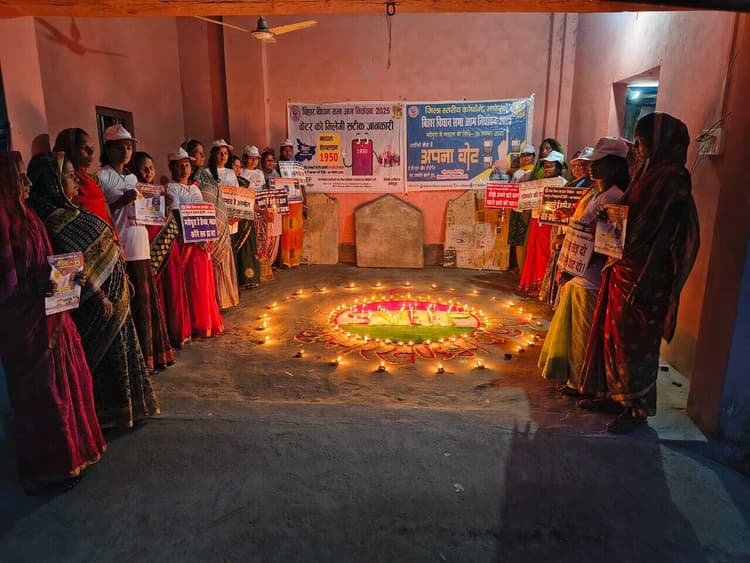 मधेपुरा. बिहार विधानसभा चुनाव को लेकर मतदाता जागरूकता अभियान स्वीप के तहत गुरुवार सूरज जीविका सीएलएफ के तत्वावधान में कार्यक्रम का आयोजन किया गया. कार्यक्रम की शुरुआत दीप प्रज्वलन व रंगोली निर्माण से हुई, जिसने मतदाता जागरूकता को एक सांस्कृतिक व भावनात्मक रंग प्रदान किया. जीविका दीदियों ने उपस्थित ग्रामीण महिलाओं व युवतियों को मतदान के महत्व, प्रक्रिया व उसकी गोपनीयता के बारे में जानकारी दी. सभी से अपील की गयी कि छह नवंबर को अपने मताधिकार का प्रयोग करें एवं लोकतंत्र के इस पर्व में अपनी सशक्त भागीदारी दर्ज करायें. मौके पर सूरज सीएलएफ की अध्यक्ष कुंती देवी, जीविका मित्र व कई महिला समूहों की दीदियां उपस्थित थी. कार्यक्रम के दौरान दीदियों ने सामूहिक शपथ लेकर 100 प्रतिशत मतदान सुनिश्चित करने का संकल्प भी लिया.