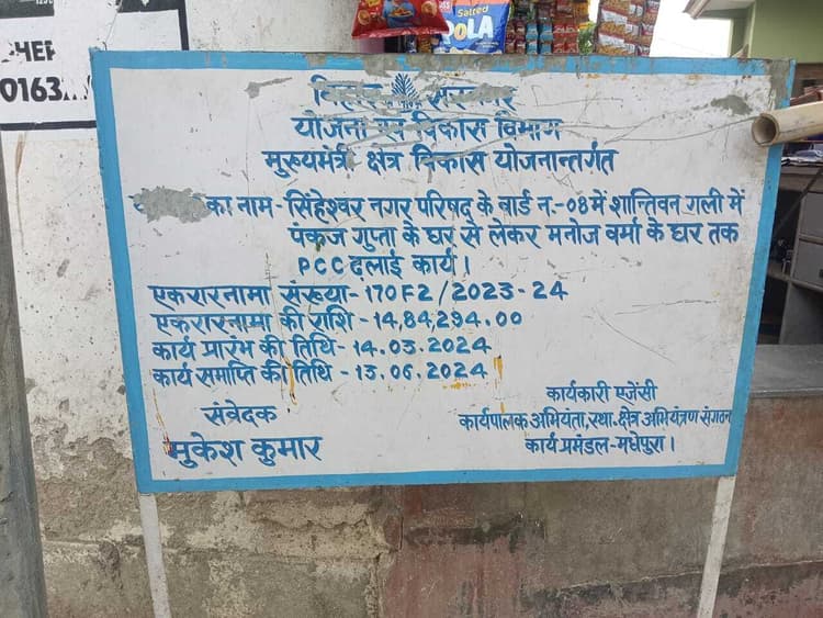 सिंहेश्वर. सिंहेश्वर नगर पंचायत क्षेत्र के वार्ड नंबर आठ में सड़क निर्माण अधूरा है. अधूरा सड़क बनाने को लेकर आयांश जन कल्याण फाउंडेशन ने मामले में मुख्यमंत्री को पत्र लिखा है. संस्था के संस्थापक बरूण कुमार मेहता ने बताया कि मुख्यमंत्री क्षेत्र विकास योजना के तहत शांति वन गली में पंकज गुप्ता के घर से मनोज वर्मा के घर तक पीसीसी ढलाई का कार्य होना था. योजना की समाप्ति तिथि 13 जून 2024 तय थी. इसके बावजूद एक साल बीतने के बाद भी सड़क निर्माण पूरा नहीं हुआ. स्थानीय लोगों ने कई बार संवेदक से शिकायत की, लेकिन संवेदक ने कभी ध्यान नहीं दिया. अधूरी सड़क से लोगों को रोजाना परेशानी झेलनी पड़ रही है. संस्था ने मुख्यमंत्री से मांग की है कि विकास मद से बन रही यह सड़क जल्द पूरी करायी जाय.