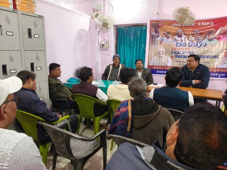 शंकरपुर. प्रखंड मुख्यालय स्थित मनरेगा कार्यालय परिसर में विकसित भारत अभियान के तहत बैठक शनिवार को हुई. इस दौरान ग्रामीण विकास विभाग द्वारा संचालित रोजगार गारंटी योजना के नए स्वरूप और मजदूरों को 125 दिनों का गारंटी रोजगार उपलब्ध कराने पर चर्चा की गयी. बैठक में प्रमुख प्रतिनिधि विवेक कुमार ने कर्मियों को योजना की नई रूपरेखा से अवगत कराया.. प्रमुख प्रतिनिधि ने बताया कि सरकार की इस पहल से पंचायतों में विकास के नये आयाम जुड़ेंगे एवं मजदूरों को साल में अधिक दिनों तक काम मिलने से उनका आर्थिक स्तर बेहतर होगा. बैठक के दौरान 125 दिनों की बढ़ी हुई रोजगार गारंटी के पोस्टर का विमोचन भी किया गया. अधिकारियों ने योजना के मुख्य उद्देश्यों पर प्रकाश डालते हुये बताया कि इसका लक्ष्य ग्रामीण क्षेत्रों में सतत रोजगार सुनिश्चित करना है. विकसित ग्राम पंचायत के माध्यम से ही विकसित भारत के सपने को साकार किया जायेगा. बताया कि प्रखंड की सभी पंचायतों में इस योजना का तेजी से प्रचार-प्रसार किया जायेगा, ताकि कोई भी पात्र मजदूर लाभ से वंचित न रहे. मौके पर मनरेगा कार्यालय के सभी कर्मी एवं तकनीकी सहायक मौजूद थे.