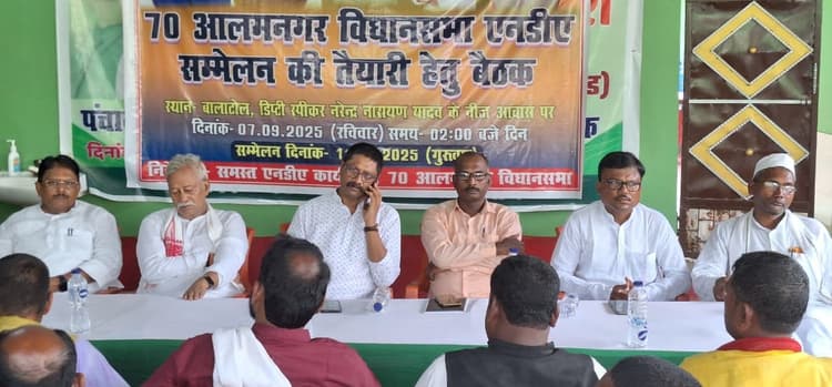 एनडीए का विधानसभा सम्मेलन को लेकर रविवार को जदयू विधायक बिहार विधानसभा के उपाध्यक्ष नरेंद्र नारायण यादव के पुरैनी प्रखंड अंतर्गत बालाटोल गांव स्थित आवास पर घटक दलों की एक बैठक हुई. बैठक की अध्यक्षता भाजपा जिला अध्यक्ष दीपक कुमार ने की जबकि संचालन आलमनगर वि० सभा प्रभारी कुणाल रत्नप्रिय के ने किया. आयोजित बैठक में एनडीए विधानसभा स्तरीय कार्यकर्ता सम्मेलन की सफलता को लेकर विचार-विमर्श हुआ.घटक दलों की रणनीतियों एवं कार्य-योजनाओं की रूपरेखा बनाई गई.बताया गया कि 11 सितंबर को आलमनगर विधानसभा सम्मेलन पुरैनी प्रखंड के नया टोला स्थित मैदान में आयोजित की जाएगी. सम्मेलन में एनडीए के सभी पांच घटक दल के बूथ स्तर से लेकर बड़े स्तर के नेता शामिल होंगे और कार्यकर्ताओं का महाजुटान होगा. कार्यक्रम को संबोधित करते हुए विधानसभा उपाध्यक्ष नरेंद्र नारायण यादव ने बूथ स्तर तक एनडीए को सशक्त करने एवं मुख्यमंत्री नीतीश कुमार के नेतृत्व में ‘मिशन-2025 और लक्ष्य-225’ की सफलता पर जोर दिया. कार्यक्रम में एनडीए के सभी पांच घटक दल के जिलाध्यक्ष मौजूद थे. भाजपा जिलाध्यक्ष दीपक कुमार, हम पार्टी के जिलाध्यक्ष चंदन ऋषिदेव एवं लोजपा के जिलाध्यक्ष दिनेश पासवान, रालोसपा जिलाअध्यक्ष हरिशंकर कुशवाहा, जदयू के वरिष्ठ उपाध्यक्ष महिंद्र पटेल, अल्पसंख्यक आयोग सदस्य मुकेश जैन, बाल श्रमिक आयोग अध्यक्ष अशोक कुमार बादल ने भी संबोधित किया.मौके पर आलमनगर भाजपा अध्यक्ष सुमीत सिंह, चौसा जदयू अध्यक्ष मनोज प्रसाद,उदाकिशुनगंज भाजपा अध्यक्ष राजीव सिंह, उदाकिशुनगंज जदयू अध्यक्ष प्रदीप मंडल, हम आलमनगर अध्यक्ष नवीन भारती, चौसा मंडल भाजपा अध्यक्ष सुबोध निषाद ,चौसा हम अध्यक्ष तपेश , वरिष्ट नेता महेन्द्र पटेल ,चौसा लोजपा (राम) कपिलदेव पासवान, पुरैनी जदयू अध्यक्ष शैलेन्द्र कुमार, पुरैनी भाजपा अध्यक्ष रौशन कुशवाहा, निर्मल ठाकुर, रजनीश कुमार उर्फ़ बबलू, पंकज ऋषिदेव, आशीष मेहता आदि मौजूद थे.