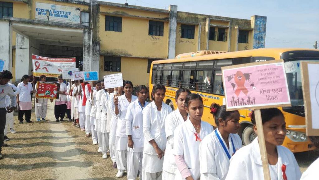 कृष्णा इंस्टिट्यूट ऑफ हायर एजुकेशन एंड नर्सिंग में रविवार को विश्व एड्स दिवस पर छात्रों-छात्राओं द्वारा जागरूकता रैली निकाली गयी.