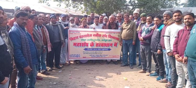प्रतिनिधि, उदाकिशुनगंज उदाकिशुनगंज अनुमंडल मुख्यालय स्थित अवर निबंधक के सभी दस्तावेज नवीस संघ ने शुक्रवार को पेपर लेस जमीन के दस्तावेजों के निबंधन के खिलाफ कालीपट्टी लगाकर सरकार की पेपर लेस प्रणाली का विरोध किया गया. वही बैठक आयोजित कर प्रस्तावित पेपर लेस निबंधन प्रणाली को लेकर सरकार के खिलाफ नाराजगी जाहिर करते हुए प्रदर्शन किया. ज्ञात हो कि बिहार दस्तावेज नवीस संघ के आह्वान पर काला बिल्ला लगाकर निबंधन का काम करने का निर्णय लिया गया. दस्तावेज नवीस संघ के अध्यक्ष सुभाष मिश्र के नेतृत्व में अस्तित्व बचाने के लिए सभी कातिबों को मजबूती के साथ एकजुट होकर संघर्ष करने का निर्णय लिया गया. इस दौरान दस्तावेज नवीस संघ के अध्यक्ष सुभाष मिश्र ने कहा बिहार सरकार के विरुद्ध में दस्तावेज नवीस संघ ने निर्णय लिया है कि नवीस संघ जबतक सरकार पेपरलेस रजिस्ट्री करने में दस्तावेज नवीस संघ के काम के बारे में सार्वजनिक नहीं करेंगे. तब तक हमलोग निबंधन का काम करने के दौरान काला बिल्ला लगा कर करेंगे. उन्होंने कहा कि बेरोजगार करने की साजिश को सफल नहीं होंगे देंगे. सरकार से किसी भी प्रणाली में दस्तावेज लेखकों की भूमिका को स्पष्ट करने की मांग की. अनुमंडल दस्तावेज नवीस संघ के सचिव संजय कुमार गुप्ता ने कहा कि किसी भी हालत में कातिबों को बेरोजगार करने की सरकार की मंशा को सफल नहीं होने देंगे. इसके लिए चट्टानी एकता का प्रदर्शन करना होगा. उन्होंने कहा कि सरकार के किसी भी विरोधी नीति का एकजुट होकर जवाब देंगे. मौके पर दिनेशचंद सिंह, देवेंद्र मिश्रा, मो. कलीम उद्दीन, श्याम सुंदर मेहता, विनोद मिश्रा, सुदर्शन आचार्य नरेश मंडल शालिग्राम शर्मा, जितेंद्र मिश्र, शंकर गुप्ता, सुशील कुमार सुमन, चक्रधर मंडल, अमोद सिंह, परमानंद सिंह, पंकज मिश्रा, डब्लू वर्मा, शत्रुघ्न मिश्रा, बैजनाथ पाठक, निरंजन मिश्रा, दिलीप मेहता, सुनील गुप्ता, रंजीत कुमार राणा, नरेश यादव, कौशल किशोर यादव, प्रमोद चौधरी, अनंत शाह आदि मौजूद थे.