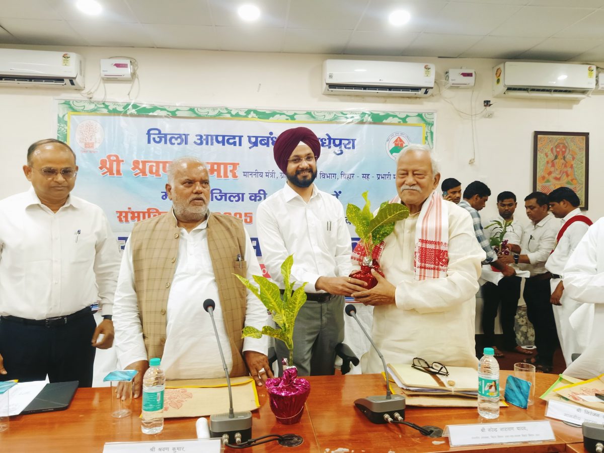 मधेपुरा. ग्रामीण विकास विभाग-सह-जिले के प्रभारी मंत्री श्रवण कुमार ने सोमवार को संभावित बाढ़ के मद्देनजर आपदा प्रबंधन की बैठक की, जिसमें बिहार विधानसभा के उपाध्यक्ष सह विधायक नरेंद्र नारायण यादव, विधायक निरंजन मेहता, प्रभारी सचिव आपदा विभाग संतोष कुमार मल्ल, जिला परिषद अध्यक्ष मंजू देवी, डीएम तरनजोत सिंह, एसपी संदीप सिंह, डीडीसी अनिल बसाक, अपर समाहर्त्ता अरुण कुमार सिंह, मुकेश कुमार सहित अनुमंडल पदाधिकारी सदर और उदाकिशुनगंज आदि मौजूद थे. बैठक में मंत्री ने संभावित बाढ़ पूर्व तैयारी यथा बाढ़ राहत सामग्रियों के दर निर्धारण की स्थिति, जिला में पॉलीथिन की उपलब्धता, नाव की व्यवस्था, बाढ़ राहत शिविर व सामुदायिक रसोई के संचालन के लिए जाने वाली तैयारी, मानव दवा की उपलब्धता, अनुग्रहित अनुदान भुगतान की स्थिति आदि के विषय में समीक्षा की. उन्होंने जिला प्रशासन, मधेपुरा द्वारा की जा रही बाढ़ पूर्व तैयारी पर संतोष प्रकट किया गया.