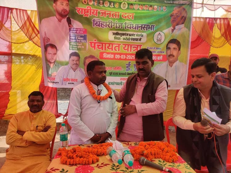 उदाकिशुनगंज प्रखंड अंतर्गत पिपरा करौती पंचायत के हनुमान मंदिर छर्रापट्टी के प्रांगण में रविवार को पंचायत यात्रा के क्रम में जनता दर्शन सह संवाद कार्यक्रम आयोजित किया गया. कार्यक्रम के दौरान जदयू के प्रदेश महासचिव रामकृष्ण मंडल एवं जदयू शिक्षा प्रकोष्ठ के प्रदेश महासचिव दयानंद शर्मा ने पूर्व राजद प्रत्याशी ई प्रभाष कुमार के समक्ष जदयू छोड़ राष्ट्रीय जनता दल में शामिल हुए. कार्यक्रम को संबोधित करते हुए मुख्य अतिथि पूर्व राजद प्रत्याशी ई प्रभाष कुमार ने जदयू छोड़कर आए हुए साथियों का स्वागत करते हुए कहा कि इनलोगों के पार्टी में आने से राष्ट्रीय जनता दल और तेजस्वी यादव जी के हाथों को और मजबूती मिलेगी. आगे उन्होंने कहा कि बिहार में जब महागठबंधन की सरकार बनेगी तो डोमिसाइल लागू किया जाएगा. बिहार सरकार की ओर से नौकरियों के लिए फॉर्म भरने का फीस भी दी जाएगी. एक युवा ही बिहार का अच्छा भविष्य लिख सकता है. इसलिए बिहार का मुख्यमंत्री भी युवा को बनाने की आवश्यकता है. उन्होंने बिहार की शिक्षा के पिछड़ेपन का उल्लेख किया और कहा कि बिहार के युवाओं को शिक्षा के प्रति एक लाख विद्यार्थी पर मात्र सात कॉलेज हैं. उन्होंने शराबबंदी की स्थिति पर भी चर्चा की और कहा कि बिहार में शराबबंदी लागू होने के बाद लगभग 13 लाख लोगों की गिरफ्तारी हुई, जिसमें 99 प्रतिशत अतिपिछड़ा और दलित समाज के लोग हैं. उन्होंने दिव्यांगों के अधिकारों के बारे में भी बात की और कहा कि महागठबंधन की सरकार बनने पर अलग से दिव्यांग मंत्रालय और आयोग का गठन किया जाएगा. उनके लिए अलग से बजट का प्रावधान किया जाएगा. प्रत्येक महिलाओं को हर महीने 2500 रुपया, पेंशन को 400 से बढ़ाकर 1500 रुपया, 200 यूनिट बिजली फ्री एवं बड़े पैमाने पर युवाओं को रोजगार दिया जाएगा. उन्होंने कहा कि बिहार में अपराध चरम सीमा पर है और लोगों के अंदर दहशत का माहौल है. लेकिन इससे सरकार को कोई मतलब नहीं है. उन्होंने बिहारीगंज विधानसभा के विकास के बारे में भी बात की और कहा कि इस क्षेत्र में पक्की सड़क, बेहतर स्वास्थ्य व्यवस्था और शिक्षा एवं उद्योग की जरूरत है, लेकिन आज तक इस ओर वर्तमान विधायक या कोई भी सरकार की ओर से ध्यान नहीं दिया गया है. विधायक का विकास से कोई सरोकार नहीं रह गया है. ई प्रभाष ने भाजपा जदयू की सरकार को मोर्चे पर विफल बताया. वही जदयू छोड़ राजद में आए प्रदेश महासचिव रामकृष्ण मंडल ने कहा कि लगातार छह महीना से मैं जदयू में घुटन महसूस कर रहा था, मुख्यमंत्री अब बिहार चलाने लायक नहीं रहे, भाजपा पूरे देश में अपना एजेंडा लागू करके हिन्दू, मुस्लिम, सिख ईसाई में लड़ाई करवाकर सत्ता में काबिज रहना चाहते हैं. इसलिए बिहार को बचाने के लिए तेजस्वी यादव को मुख्यमंत्री बनाने की जरूरत है. दया