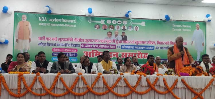 मधेपुरा. कला भवन में सोमवार को विधायक सह बिहार विधानसभा के उपाध्यक्ष नरेंद्र नारायण यादव, सिंहेश्वर के विधायक सह पूर्व मंत्री डॉ रमेश ऋषिदेव का नेताओं व कार्यकर्ताओं ने स्वागत किया. विधानसभा के उपाध्यक्ष ने कहा कि मधेपुरा के तीनों विधानसभा के कार्यकर्ताओं ने मेहनत कर जदयू प्रत्याशी को जिताया. समय आ गया है. हम सभी विधायक मिलकर मधेपुरा के विकास को आगे बढ़ाते रहेंगे एवं गरीब लोगों की मदद करते रहेंगे. वहीं जदयू जिलाध्यक्ष सह सिंहेश्वर विधायक प्रो रमेश ऋषिदेव ने जदयू एवं राजग गठबंधन के तमाम नेताओं एवं कार्यकर्ताओं को बधाई देते हुये कहा कि जिस प्रकार आप लोगों ने जदयू प्रत्याशी को जिताने का काम किया है. हमलोग आप के विश्वास पर खड़े उतरेंगे. मौके पर बीजेपी जिलाध्यक्ष दीपक कुमार, लोजपा के अध्यक्ष दिनेश पासवान, रालोमो के पिंटू मेहता, हम के चंदन ऋषिदेव, जदयू के प्रवक्ता डॉ राजीव जोशी, महेंद्र पटेल, शैलेश सिंह, रामचंद्र चौधरी, नरेश पासवान, गुड्डी देवी, त्रिभुवन मंडल, डॉ नीरज कुमार, युगल पटेल, धर्मेंद्र राम समेत जिला के कार्यकारिणी सदस्य, प्रखंड अध्यक्ष आदि लोगों ने विधायक को सम्मानित किया