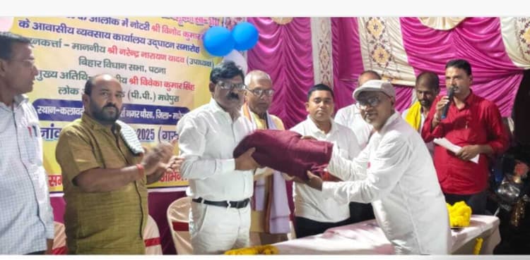 साहित्यकार सह अधिवक्ता विनोद आजाद बने नोटरी मजिस्ट्रेट, चौसा वासियों में खुशी मधेपुरा/चौसा कहते हैं जो चीज एक प्रतिभावान आदमी को सफल आदमी से अलग करती है. वह कठिन परिश्रम है. सफलता की सीढ़ी ही परिश्रम है. उक्त बातें लोक अभियोजक विवेका कुमार सिंह के द्वारा अपने उद्घाटन संबोधन के दौरान कही गई. साहित्यकार सह अधिवक्ता विनोद आजाद के नोटरी मजिस्ट्रेट बनने पर चौसा के आवासीय कार्यालय में आयोजित सम्मान समारोह को संबोधित करते हुए मधेपुरा के लोक अभियोजक विवेका कुमार सिंह ने कहा कि जिन्हें जीवन में कुछ अलग हटकर करने का जज्बा हो उन्हें सम्मान और पहचान के लिए किसी का मोहताज होना नहीं पड़ता है. विनोद आजाद ने करीब 20 वर्षों तक पत्रकारिता जगत में अपनी लोहा मनवाया. इनके द्वारा लिखित कई प्रकाशित पुस्तकों ने काफी प्रतिष्ठा पाई हैं. सम्मान समारोह को संबोधित करते हुये क्षेत्रीय विधायक सह विधानसभा उपाध्यक्ष नरेंद्र नारायण यादव की धर्मपत्नी बेबी रानी ने कहा कि आजाद हमेशा गरीब गुरबों को सस्ता व सुलभ न्याय दिलाने के पक्षधर रहे हैं. समाजसेवा के लिए विनोद आजाद एक जाना पहचाना नाम है. जदयू प्रखंड अध्यक्ष मनोज प्रसाद ने कहा कि विनोद आजाद का सरल जीवन युवा पीढ़ियों के लिए प्रेरणास्रोत है. इन्होंने कई बार विपरीत से विपरीत परिस्थितियों में भी अपनी धैर्य और महानता का परिचय दिया है. कार्यक्रम को मुख्य रूप से प्रो. नवल किशोर जयसवाल, मनोज सिंह कुशवाहा, सांसद प्रतिनिधि कुंदन कुमार बंटी, कम्युनिस्ट नेता श्यामसुंदर शर्मा, पुर्व भाजपा अध्यक्ष सुबोध कुमार सिंह, नेता सुबोध कुमार पासवान, साहित्यकार संजय कुमार सुमन, अधिवक्ता उत्तम कुमार, शिक्षक जयप्रकाश मंडल आदि ने भी संबोधित किया. जबकि मौके पर प्रमुख रूप से बार एसोसिएशन के उपाध्यक्ष गणपति मेहता, कोषाध्यक्ष अभिनेश्वर मिश्रा, निगरानी समिति सदस्य संजय कुमार यादव, राजेंद्र मेहता, अरुण कुमार महतो, प्रभात कुमार, सरपंच प्रतिनिधि मोहम्मद कुर्बान, क्षितिज प्रसाद सिंह, उप सरपंच लाल बहादुर शर्मा, जदयू युवा अध्यक्ष नरोत्तम कुमार गांधी, जीवन कुमार ज्योति आदि मौजूद थे.