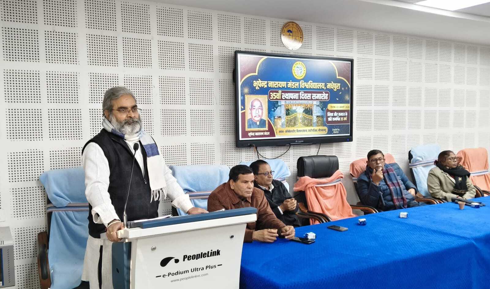 मधेपुरा. बीएन मंडल विश्वविद्यालय का 35वां स्थापना दिवस शनिवार को विश्वविद्यालय के नॉर्थ कैंपस में मनाया गया. कार्यक्रम के दौरान वक्ताओं ने विश्वविद्यालय की स्थापना, उद्देश्य व 35 वर्षों की शैक्षणिक उपलब्धियों पर प्रकाश डाला. विभागाध्यक्षों ने कहा कि बीएन मंडल विश्वविद्यालय ने कोसी-सीमांचल क्षेत्र में उच्च शिक्षा के प्रसार में अहम भूमिका निभायी है. विश्वविद्यालय ने शिक्षा के साथ-साथ शोध, नवाचार व सामाजिक सरोकार के क्षेत्र में भी अपनी सशक्त पहचान बनायी है. वक्ताओं ने गुणवत्तापूर्ण शिक्षा, शोध कार्य को बढ़ावा देने व विद्यार्थियों के सर्वांगीण विकास पर जोर दिया. छात्रों से अनुशासन, परिश्रम व नैतिक मूल्यों को आत्मसात करते हुए अध्ययन करने की अपील की गयी. मौके पर रसायन शास्त्र विभागाध्यक्ष डॉ नरेश कुमार, जंतु विज्ञान विभागाध्यक्ष डॉ नरेंद्र श्रीवास्तव, भौतिक शास्त्र विभागाध्यक्ष डॉ उमाशंकर चौधरी, होम साइंस विभागाध्यक्ष डॉ विमला कुमारी, साइक्लॉजी विभागाध्यक्ष डॉ एम आई आर रहमान, प्रो अजय कुमार दास, प्रो अरुणाभ सेनगुप्ता, डॉ टुंपा, समाजशास्त्र विभाग से डॉ नफीसा अनाज व डॉ पुष्पा, मानव शास्त्र विभाग से डॉ अरविंद प्रकाश सूरज एवं डॉ निशा कुमारी सहित अन्य अन्य विभाग के शिक्षक उपस्थित थे. इसके अलावा सहायक कर्मचारी राम नरेश भारती, रिसर्च स्कॉलर प्रशांत कृष्णा, अंशु कुमार, कृष्णा कुमार, आशीष कुमार, अनिमेष आनंद सहित अन्य छात्र-छात्राएं भी समारोह में शामिल हुए. कार्यक्रम के अंत में विश्वविद्यालय की शैक्षणिक गरिमा को बनाए रखने एवं इसके निरंतर विकास के लिए सामूहिक प्रयास का संकल्प लिया गया.