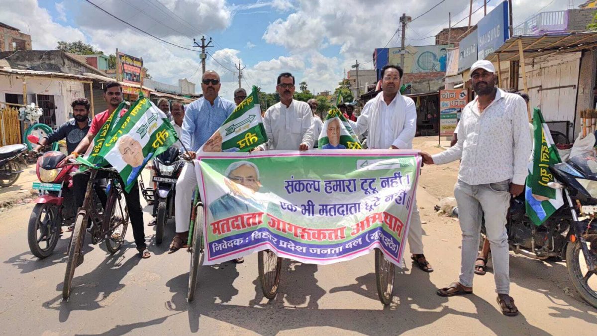 गम्हरिया. प्रखंड क्षेत्र में जदयू कार्यकर्ताओं ने मतदाता जागरूकता को लेकर मंगलवार को साइकिल रैली निकाली गयी, जिसकी अध्यक्षता जदयू प्रखंड अध्यक्ष प्रभु नारायण मेहता ने की. रैली का मुख्य उद्देश्य लोगों को मतदाता सूची में नाम जुड़वाने और संशोधन के लिए प्रेरित करना था. रैली प्रत्येक पंचायत के पंचायत अध्यक्ष की अध्यक्षता में आयोजित की गयी. औराही एकपराहा में विकाश कुमार, भेलवा में मुकेश कुमार सिंह, बभनी में बलराम मंडल, कौरिहार तरावे में नंदन कुमार, चिकनी फुलकाहा में अमरेन्द्र यादव, जीवछपुर में दिनेश चौधरी, इटवा जीवछपुर में सुरेंद्र मेहता की अध्यक्षता में आयोजित की गयी. प्रखंड अध्यक्ष प्रभु नारायण मेहता ने बताया कि रैली का मुख्य उद्देश्य 2025 में फिर से नीतीश कुमार को जीत दिलाने को लेकर हर घर जायेंगे. रैली में प्रखंड उपाध्यक्ष सह मुखिया प्रतिनिधि रूपेश कुमार सिंह, राजा कुमार, मोहम्मद सुभाण सत्यनारायण मंडल, अनिल मेहता, मिथिलेश कुमार, शम्भु सिंह,राहुल सिंह आदि शामिल हुए.