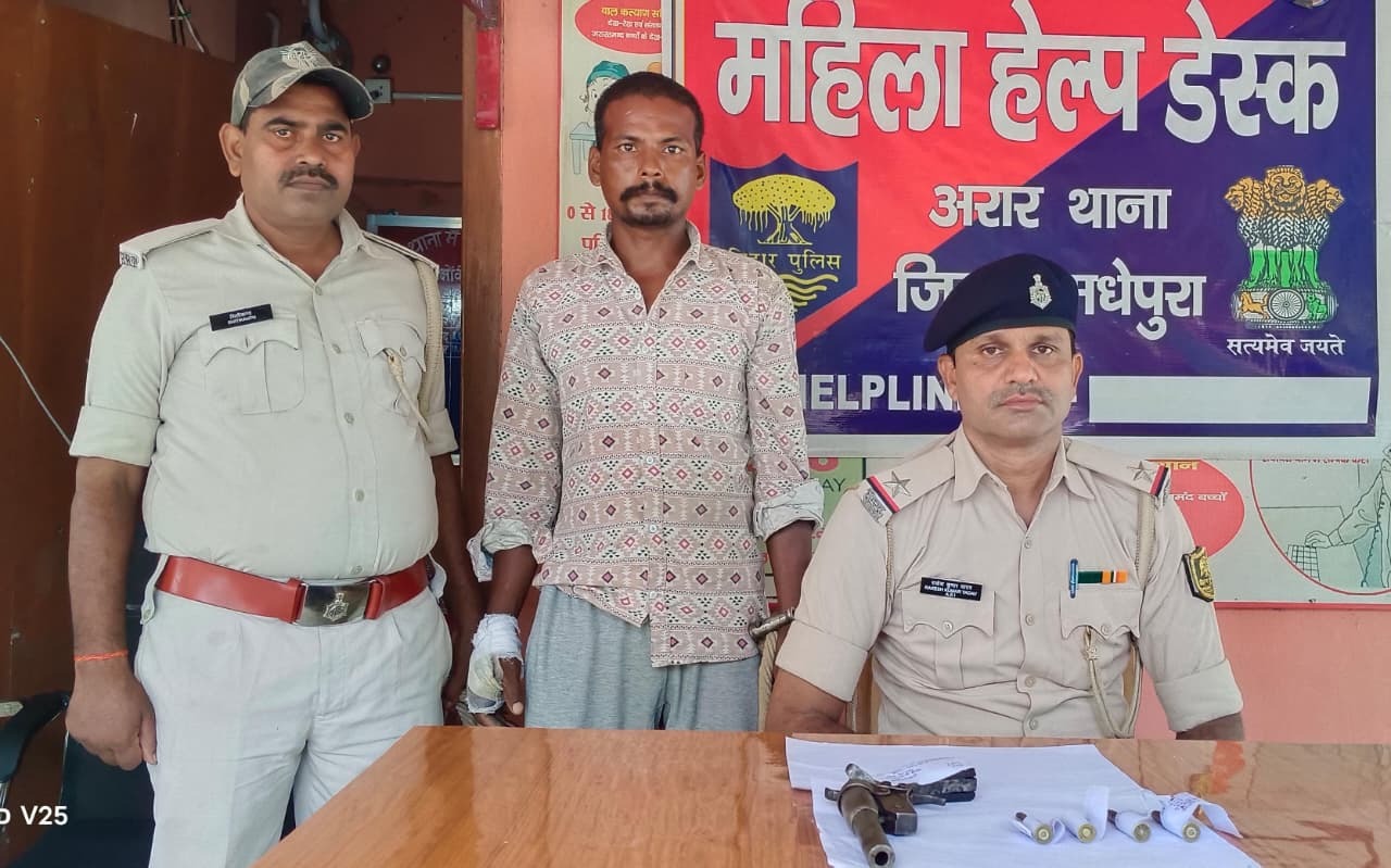 ग्वालपाड़ा. शनिवार को अरार थाना में कार्यरत एएसआई कृत्नारायण प्रसाद यादव, सिपाही अजहरुद्दीन अंसारी, सिपाही मोती लाल सिंह वाहन चेकिंग करते हुए थाना क्षेत्र के कमलपुर गांव पहुंचे तो देखा कि एक जगह बहुत लोग जमा हैं तथा एक युवक को पकड़े हुए हैं. पूछने पर बताया कि पकड़ाया युवक अनावश्यक लोगों को गाली-गलौज कर रहा था. युवक को लोगों के गिरफ्त से पुलिस पदाधिकारी अपनी सुरक्षा में लेकर जब उसकी तलाशी ली तो युवक के पायजामा के दाहिनी तरफ कमर में एक लोडेड कट्टा व बाई तरफ पॉकेट से तीन कारतूस बरामद किया गया. नाम पता पूछे जाने पर अपना नाम चंदन मेहता, निवासी बिशनपुर अरार वार्ड नंबर चार बताया. गश्ती दल के द्वारा गिरफ्तार किये गये युवक चंदन मेहता को बरामद कट्टा समेत चार कारतूस के साथ अरार थाना लाया गया. थानाध्यक्ष विकास कुमार ने बताया कि गिरफ्तार युवक चंदन मेहता के खिलाफ आर्म्स एक्ट के तहत मामला दर्ज कर जेल भेजा गया है.