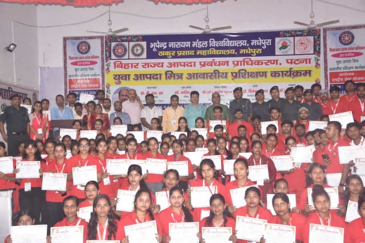 ठाकुर प्रसाद महाविद्यालय स्थित परीक्षा भवन सभागार में आयोजित सात दिवसीय युवा आपदा मित्र प्रशिक्षण कार्यक्रम का समापन हो गया. समापन के अवसर पर एडीएम अरुण कुमार सिंह, एडीएमओ आपदा शिवदयाल, विश्वविद्यालय कुल सचिव प्रो डॉ अशोक कुमार सिंह, विश्वविद्यालय एनएसएस पदाधिकारी डॉ विवेक कुमार व महाविद्यालय प्राचार्य प्रो डॉ कैलाश प्रसाद यादव ने प्रशिक्षण ले रहे छात्र-छात्राओं को आपदा किट व प्रमाण पत्र सुपुर्द किया. साथ ही प्रशिक्षण ले रहे छात्र-छात्राओं को शुभकामना देते हुये आपदा में खुद को व समाज को सुरक्षित रखने का संकल्प भी दिलाया. एडीएम ने बताया कि केंद्र व राज्य सरकार के निर्देश पर आपदा विभाग द्वारा छात्र-छात्राओं को प्रशिक्षित करने का निर्देश दिया गया था. जिले के विभिन्न महाविद्यालय में पढ़ रहे छात्र-छात्राओं के लिए बेहतर माहौल में प्रशिक्षण दिया गया. प्रशिक्षण ले चुके बच्चे अब आपदा से अपनी और हम लोगों की सुरक्षा करेंगे.विश्वविद्यालय एनएसएस पदाधिकारी डॉ विवेक कुमार ने बताया कि भूपेंद्र नारायण मंडल विश्वविद्यालय में आपदा का पहला प्रशिक्षण दिलाया गया. विश्वविद्यालय के 150 बच्चों को आपदा किट व प्रमाण पत्र दिया गया. उन्हें सभी प्रकार के आपदा से लड़ने के लिए तैयार किया गया है. आगे भी ऐसी प्रक्रिया की जायेगी. महाविद्यालय के प्राचार्य प्रो डॉ कैलाश प्रसाद यादव ने बताया कि विश्वविद्यालय के निर्देश पर बेहतर माहौल में बच्चों को प्रशिक्षित किया गया था, जिससे वे प्राकृतिक आपदा में समाज, परिवार, शहर व कसबा को बचाने में महती भूमिका का निर्वहन करेंगे. पढ़ाई के अतिरिक्त यह प्रशिक्षण उन्हें कोशी इलाके में आने वाले आकाशीय बिजली गिरने की आपदा के साथ साथ बाढ़, भूकंप व अगलगी जैसी आपदाओं में अहम भूमिका निभायेंगे.मौके पर महाविद्यालय एनएसएस पदाधिकारी डॉ मिंटू कुमार मेनन, डॉ राकेश कुमार, महाविद्यालय परीक्षा नियंत्रक डॉ कुमार गौरव, डॉ विजय कृष्णा, डॉ चंद्रदीप यादव, डॉ मनोज कुमार ठाकुर, डॉ शहरयार अहमद, डॉ मनीष कुमार, बड़ा बाबू नारायण ठाकुर, धीरेंद्र ठाकुर, प्रणव ठाकुर, महेश कुमार, हमीद राजा, लाल बहादुर यादव, सुनील यादव, मोती यादव, राधे यादव आदि मौजूद थे.