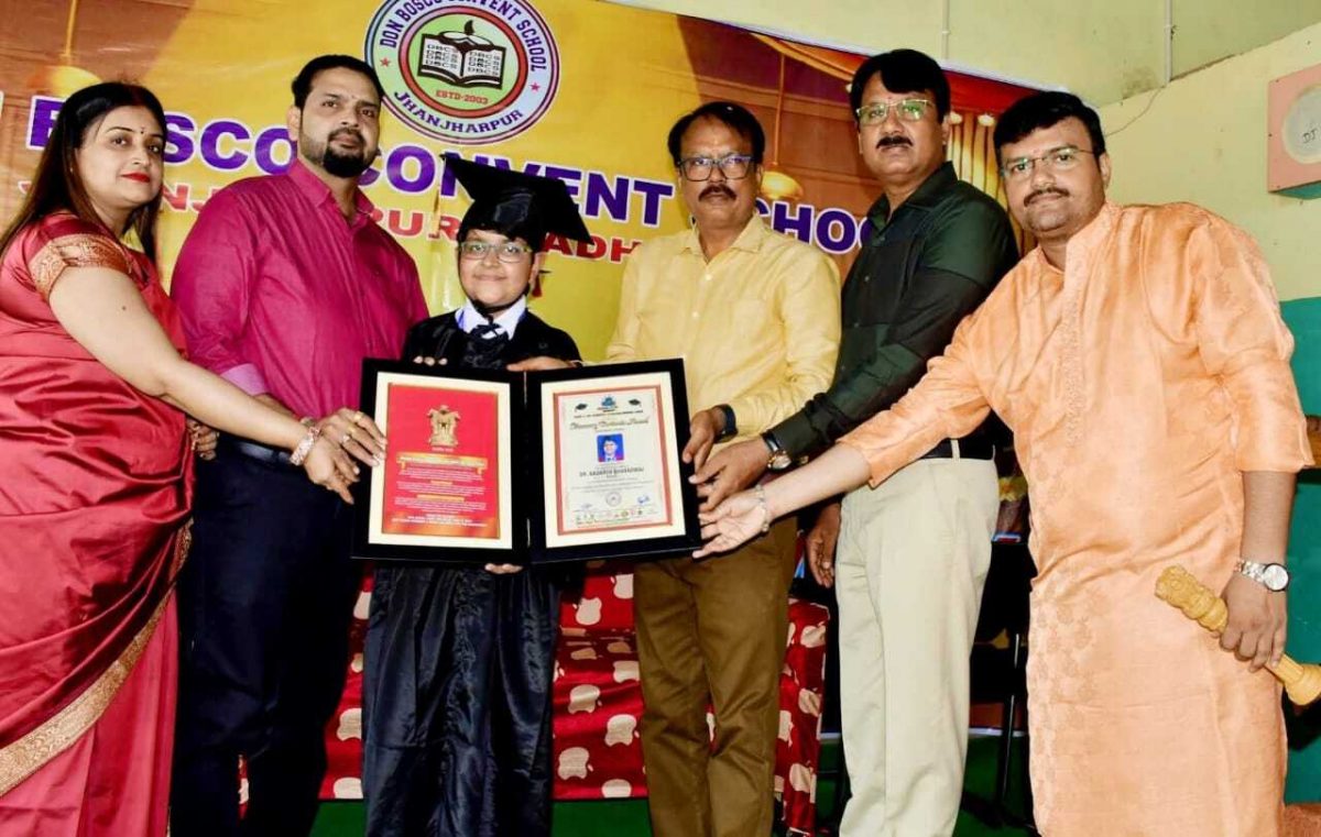 डॉन बॉस्को कॉन्वेंट स्कूल में कक्षा 6 के छात्र आदर्श भारद्वाज को समारोह आयोजित कर डॉक्टरेट की उपाधि का प्रमाण पत्र प्रदान किया गया.