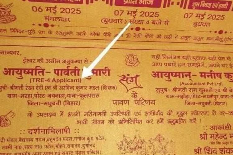 इस शादी के कार्ड में लड़की के नाम के नीचे लिखा गया है, ‘टीआरई-4 अभ्यर्थी’, यानी वह अभी शिक्षक नहीं बनी है, बल्कि शिक्षक भर्ती की परीक्षा की अभ्यर्थी है. वहीं लड़के के नाम के नीचे लिखा गया है- “अकाउंटेंट प्राइवेट लिमिटेड”. इससे यह नहीं पता चलता है कि वह कहां और किस कंपनी में कार्यरत है.