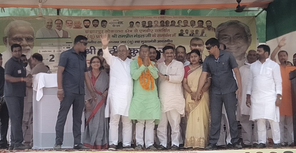 झंझारपुर लोकसभा क्षेत्र के बाबूबरही बाजार स्थित जगदीश नंदन प्लस टू हाई स्कूल मैदान में मंगलवार एनडीए प्रत्याशी आरपी मंडल के पक्ष में सीएम नीतीश कुमार ने चुनावी सभा को संबोधित किया. इस दौरान उन्होंने बिहार सरकार द्वारा किये गये कार्यों से लोगों से अवगत कराया और आरपी मंडल के लिये लोगों से आशीर्वाद मांगा. सीएम ने राजद पर नाम लिये बिना जमकर प्रहार किया. उन्होंने कहा कि हम लोग सभी के लिये काम करते हैं. हर एक के लिये कल्याणकारी योजनाएं संचालित कर रहे हैं. पूरा बिहार हमारा परिवार है. जबकि वे अपने और अपने परिवार के लिये ही सोचते और काम करते हैं.