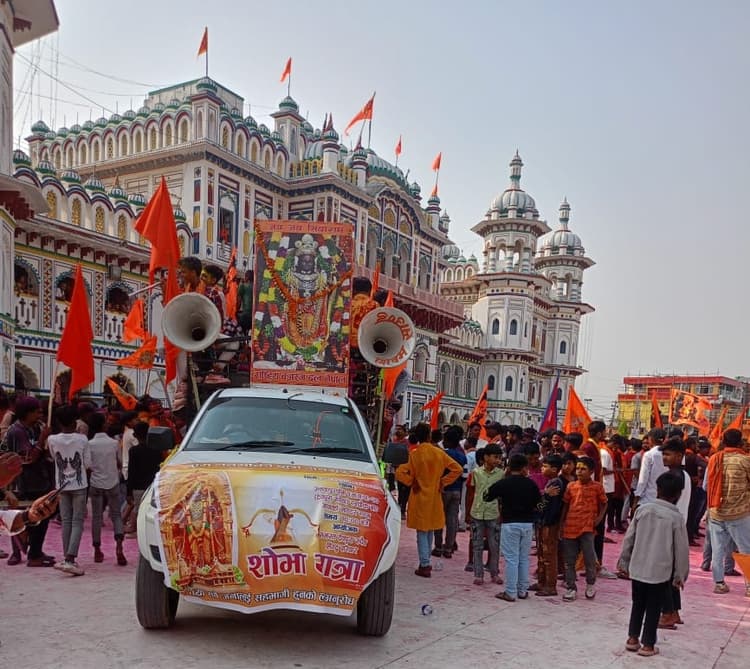 प्रभु श्री राम के ससुराल जनकपुरधाम में राम नवमी महोत्सव रविवार को धूमधाम से मनाया गया. सुबह से ही श्रद्धालु गंगासागर सरोवर, दूधमती नदी में स्नान कर जानकी मंदिर, राम मंदिर सहित अन्य मंदिरो में पूजा पाठ किया. राम मंदिर, जानकी मंदिर सहित अन्य मठ मंदिरों को भव्यता रुप से सजाया गया था. जानकी मंदिर, राम मंदिर सहित आस पास के घरों से प्रभु श्रीराम के जन्मोत्सव पर बधाई गीत गुंजयमान रहा. प्रभु के जयकारा से चारों दिशा गुंजायमान हो रहा था. जनकपुर धाम के कई मंदिरों में अष्टयाम का आयोजन किया गया. राम नवमी के अवसर पर नेपाल तथा भारत से बड़ी संख्या में साधु -संत जनकपुरधाम पहुंचे. नेपाल हिंदू सेना, जानकी सेना ने जानकी मंदिर से शोभा यात्रा निकाली. वहीं विश्व हिन्दू परिषद धनुषा के अध्यक्ष संतोष कुमार साह के नेतृत्व में राम मंदिर से विशाल शोभा यात्रा निकाली गयी. इस अवसर पर सभी मठ, मंदिरों में भंडारे का आयोजन किया गया. जनकपुरधाम के अलावा देहाती क्षेत्रों से भी श्रद्धालुओं ने गाजे बाजे व राम जानकी की झांकी के साथ शोभायात्रा में शामिल हुए. शोभा यात्रा को लेकर धनुषा जिला प्रशासन के द्वारा सुरक्षा का पुख्ता इंतजाम किया गया था.