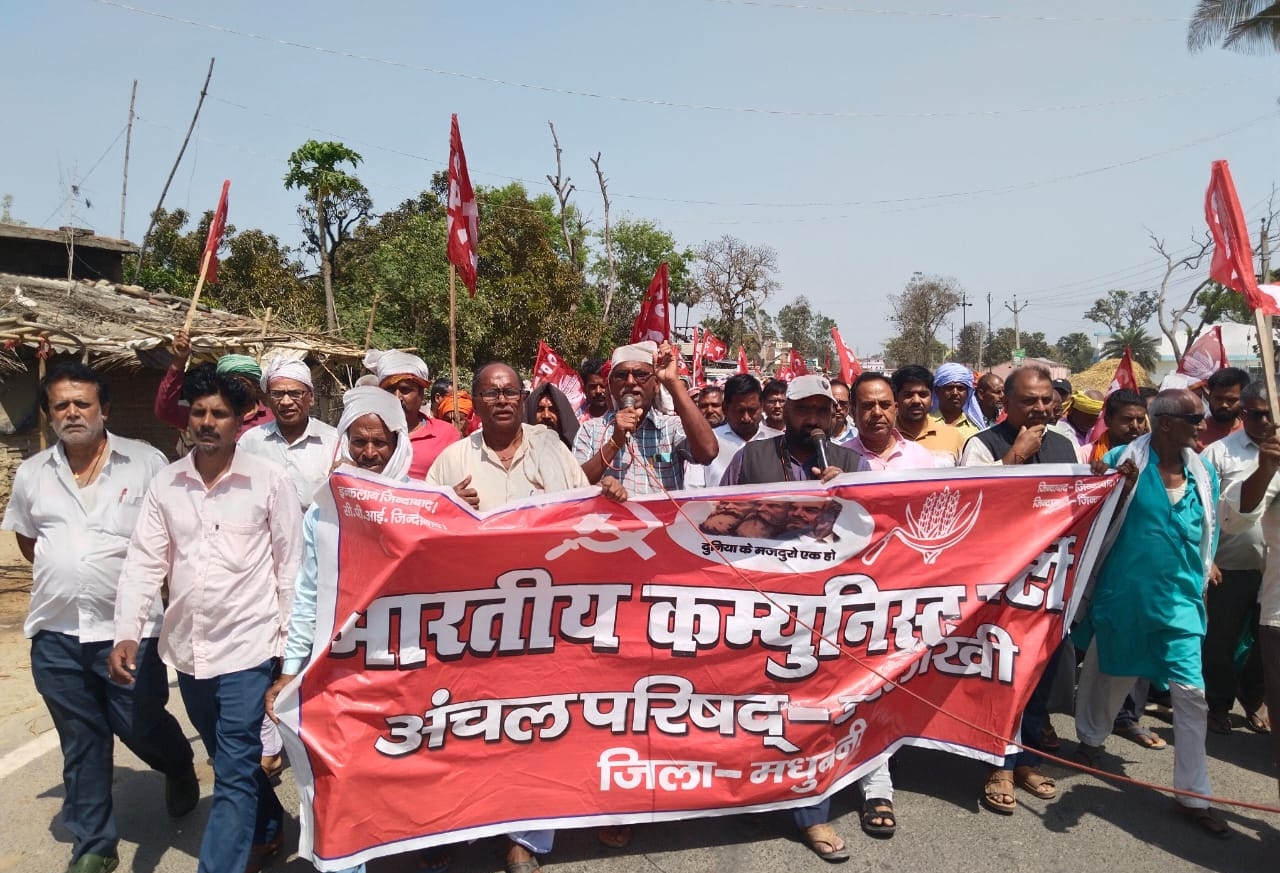 हरलाखी. प्रखंड कार्यालय पर भारतीय कम्युनिस्ट पार्टी के कार्यकर्ता ने विभिन्न मांगें पूरी कराने के लिए प्रदर्शन किया. अध्यक्षता अंचल मंत्री बिलटू प्रसाद महतो ने की. मुख्य अतिथि पार्टी के राज्य सचिव एवं पूर्व विधायक राम नरेश पांडेय ने कहा कि एनडीए की सरकार में बेरोजगारी व भ्रष्टाचारी चरम पर है. महंगाई रुकने का नाम नहीं ले रहा है. बिहार में आगामी सरकार महागठबंधन की होगी. कहा कि 11 सूत्री जनता की मांगों को लेकर प्रदर्शन किया गया है. जिसमें प्रधानमंत्री आवास योजना में नाम जोड़ने के नाम पर व्याप्त भ्रष्टाचार पर रोक लगाने, सामाजिक सुरक्षा पेंशन बढ़ाकर तीन हजार करने, सभी लाभार्थियों को 35 किलो अनाज देने, 200 यूनिट बिजली मुफ्त करने, सभी बेघर को पांच डिसमिल जमीन व आवास देने सहित अन्य मांगे है. मौके पर जिला मंत्री मिथिलेश झा, राज्य परिषद सदस्य राकेश कुमार पाण्डेय, पूर्व प्रमुख राजेश कुमार पाण्डेय, रमन चौधरी, मदन राम, गिरिंदर राय, बलराम यादव सहित सैकड़ों लोग पार्टी कार्यालय पर नारेबाजी कर प्रदर्शन किया.
