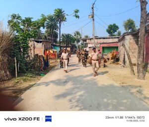 लखनौर. विधानसभा चुनाव के लिए प्रशासन पूरी तरह सतर्क है. इसी क्रम में शनिवार को लखनौर थाना क्षेत्र के सभी संवेदनशील पंचायतों में केंद्रीय सशस्त्र पुलिस बल एवं स्थानीय पुलिस बल संयुक्त फ्लैग मार्च और एरिया डोमिनेशन किया. थानाध्यक्ष के नेतृत्व में सुरक्षा बलों ने लखनौर, लौफा, बेला, खैरी, तमुरिया, गंगापुर सहित विभिन्न पंचायतों में मार्च निकालकर लोगों से शांति एवं सौहार्द बनाये रखने की अपील की. फ्लैग मार्च के दौरान पुलिस अधिकारियों ने ग्रामीणों से निष्पक्ष और भयमुक्त माहौल में मतदान करने की अपील की. आश्वस्त किया कि किसी भी प्रकार की असामाजिक या अवांछित गतिविधि बर्दाश्त नहीं की जाएगी. थानाध्यक्ष कार्तिक भगत ने कहा कि चुनाव के लिए पुलिस-प्रशासन पूरी तरह अलर्ट है. सुरक्षा व्यवस्था की लगातार समीक्षा की जा रही है. सभी बूथों पर गश्ती और निगरानी बढ़ा दी है.