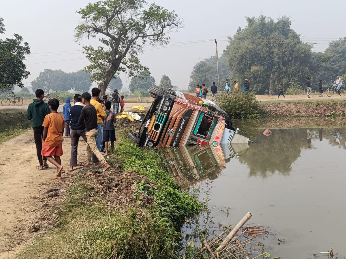 Madhubani News : पुलिस के पीछा करने पर सड़क किनारे तालाब में पलटा ट्रक