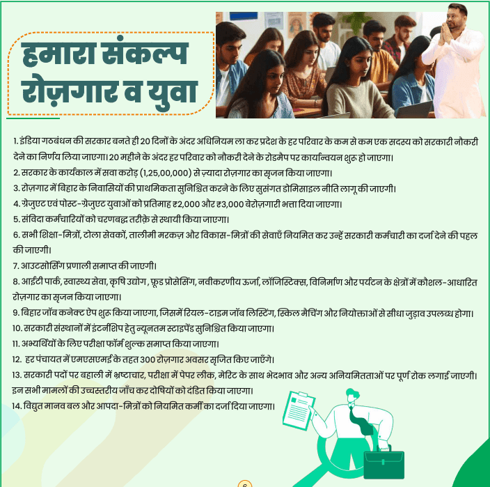 - हर परिवार से एक सदस्य को सरकारी नौकरी देने का निर्णय— सरकार बनने के 20 महीनों के अंदर रोजगार देने की प्रक्रिया शुरू होगी.