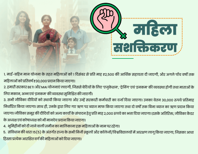 - महिला सशक्तिकरण के तहत शिक्षा, स्वास्थ्य, प्रशासन, विधि, पुलिस और सुरक्षा बलों में महिलाओं की भागीदारी बढ़ाई जाएगी.