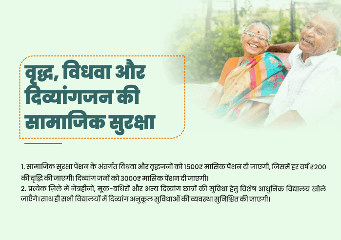 - विधवा और वृद्धजन को सामाजिक सुरक्षा पेंशन के तहत ₹1,500 मासिक पेंशन दी जाएगी, जिसमें हर वर्ष ₹200 की वृद्धि की जाएगी.