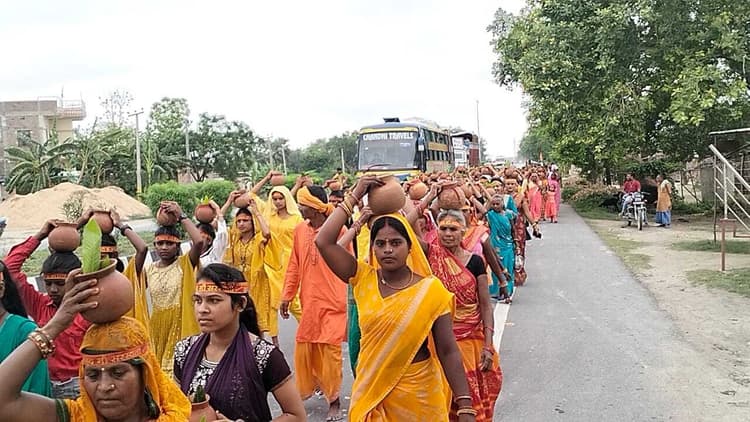 कोटवा. प्रखंड के बडहरवा कला पूर्वी पंचायत अंतर्गत कल्याणपुर खास में स्थित भगवती स्थान परिसर में 24 घंटा का अखंड अष्ट्याम का आयोजन किया गया है.जिसको लेकर बुधवार को भव्य कलश यात्रा निकाली गई. जिसमे रंग बिरंगे विभिन्न परिधानों से सुसज्जित गांव भर की कुआंरी कन्याएं और महिलाएं माथे पर कलश लिए शामिल हुई. कलश यात्रा गाजे बाजे,छोटी बड़ी गाड़िया सहित बड़े बड़े पताका लिए यज्ञ स्थल से चलकर कोटवा बाजार से एनएच 27 से होते हुए दीपऊ तिरहुत मेन कनाल पहुंचा. जहां आचार्य पंडित रामचंद्र तिवारी द्वारा यजमान सरपंच मैनेजर सहनी साथ वैदिक उच्चारण द्वारा जलबोझी कराया गया. जलबोझी के बाद कलश यात्रा वहा से चलकर कोटवा हाई स्कूल के पीछे से होते हुए पुन यज्ञ स्थल तक पहुंचा. अष्ट्याम के अध्यक्ष भगत संजय सहनी ने बताया कि अष्ट्याम 24 घंटे तक चलेगा जो 27 जून से शुरू होकर 28 जून को समाप्त होंगा. उसके बाद भंडारे का आयोजन किया जायेगा.आगे कहा कि संत यमुना दास,संत जगरनाथ दास, संत सुखाड़ी दास के अथक प्रयास एवं ग्रामीणों के सहयोग से इस अखंड अष्ट्याम का आयोजन किया जा रहा है. मौके पर अजय सहनी,फुलेना सहनी,पन्नालाल कुशवाहा,जगरनाथ कुशवाहा, रघुनी भगत,उमाशंकर भगत,चंदेश्वर मिश्र, मंटू पाण्डेय,पप्पू पाण्डेय सहित बड़ी संख्या श्रद्धालु शामिल थे.