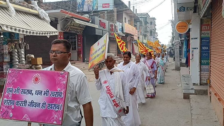 अरेराज. विश्व तंबाकू एवं व्यसन मुक्ति दिवस के अवसर पर स्थानीय ब्रह्माकुमारी सेवा केंद्र द्वारा शनिवार को पूरे नगर क्षेत्र में बड़ा ही आकर्षक जागरूकता यात्रा निकाली गयी. यात्रा का शुभारंभ करते हुए उत्तर बिहार की वरिष्ठ राजयोगिनी बीके मीना दीदी ने कहा कि व्यसन न सिर्फ शरीर को खोखला करता है, बल्कि मन मस्तिष्क एवं विचार को भी कुंठित कर देता है और इतना जहर भरता है जिससे घर परिवार तबाह और बर्बाद हो जाता है. उन्होंने सेवा केंद्र के सभी भाई बहनों को व्यसन मुक्ति जागरूकता अभियान घर-घर चलाने का संकल्प कराया. यात्रा का शुभारंभ सेवा केंद्र से हुआ जो गांधीनगर गांव होते हुए अरेराज मंदिर रोड एवं मुख्य चौक तथा ब्लॉक तक गया, फिर वापस सेवा केंद्र पहुंचा. व्यसन जागरूकता मुख्य नारा था “व्यसन छोड़ो और शिव बाबा से नाता जोड़ो ” “व्यसन है सब बुराई का जड़ ” एक दो एक दो वीडी सिगरेट छोड़ व्यसन मुक्त भारत बनाना है विश्व में भारत का झंडा लहराना है “. यात्रा में शामिल होने वालों में मुख्य रूप से बीके रेखा, बी के आरती, बीके सुहानी बहन ,डॉक्टर एमपी नारायण ,बीके अभिमन्यु भाई, बीके योगी गिरी ,बीके शिव प्रसाद गिरी,बी के नंदू प्रसाद, बीके विश्वनाथ प्रसाद ,शांति देवी, शिव कुमारी देवी, राखी कुमारी आदि मुख्य रूप से थी.