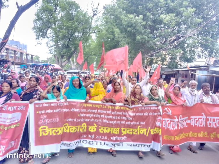 Motihari: मोतिहारी. रसोइया,आशा ,आंगनबाड़ी, जीविका कैडर, रात्रि प्रहरी/सफाई कर्मी को सरकारी कर्मचारी का दर्जा और सम्मानजनक मानदेय देने की मांग को लेकर मंगलवार को समाहरणालय द्वार पर भाकपा माले के श्रमिक संगठन ऐक्टू जिला से संबद्ध संगठनों ने जोरदार प्रदर्शन किया व नेताओं ने जिला प्रशासन को ज्ञापन सौंपा. बिहार राज्य आशा कार्यकर्ता संघ गोप गुट संबद्ध ऐक्टू एवं बिहार राज्य विद्यालय रसोइया संघ ऐक्टू के संयुक्त बैनर तले सैकड़ों स्कीम वर्कर जुटे और सरकार से न्यूनतम 41 हजार रुपये मासिक मानदेय, पेंशन, बीमा, प्रोन्नति व सरकारी कर्मी का दर्जा देने की मांग की. जिला प्रशासन अविलंब रात्रि प्रहरी का मानदेय भुगतान करने की मांग की.बिहार राज्य आशा कार्यकर्त्ता संघ गोपगुट संबद्ध ऐक्टू की जिलाध्यक्ष सबिता देवी, और बिहार राज्य विद्यालय रसोइया संघ की जिलाध्यक्ष कुमांति देवी ने केंद्र सरकार से मांग की कि सभी स्कीम वर्कर्स को सम्मानजनक वेतन व सरकारीकर्मी का दर्जा देने की घोषणा की जाए. प्रदर्शन को भाकपा माले जिला सचिव प्रभुदेव यादव ,राघव साह, राजेश कुमार ने संबोधित किया.प्रदर्शन में छविलाल महतो, मो ,शबनम खातुनइस्राफील शंभुशरण,बिगन राम ,मालती देवी, रेखा देवी , गायत्री देवी,किसनावती देवी, हरे राम महतो प्रहलाद शर्मा रुक्मिणी बाला आदि शामिल रही.