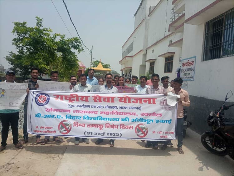 Motihari: रक्सौल . शहर के कॉलेज रोड स्थित खेमचंद ताराचंद महाविद्यालय में राष्ट्रीय सेवा योजना (एनएसएस) के द्वारा आयोजित एक कार्यक्रम के तहत विश्व तंबाकू निषेध दिवस पर जागरूकता रैली निकाली गयी. इसके अलावे, तंबाकू से होने वाले नुकसान को बताते हुए पोस्टर मेकिंग, पेटिंग प्रतियोगिता व निबंध प्रतियोगिता का भी आयोजन किया गया. इस कार्यक्रम की अध्यक्षता महाविद्यालय के प्राचार्य डॉ. प्रो. संत साह ने की. कार्यक्रम के दौरान कॉलेज के अध्यापकों के द्वारा बच्चों को तंबाकू सेवन के दुष्प्रभाव के बारे में भी बताया गया. राष्ट्रीय सेवा योजना के कार्यक्रम प्रभारी प्रो. प्रेमप्रकाश ने कहा कि तंबाकू का सेवन करने से स्वास्थ्य पर प्रतिकूल प्रभाव पड़ता है. तंबाकू के खपत को कम करने के लिए प्रभावी नीतियों और कानूनों के बारे में विस्तार से बताया गया. आयोजित कार्यक्रम को संबोधित करते हुए प्राचार्य संत साह ने कहा कि तंबाकू की लत से आदमी को कई प्रकार की हानि होती है. तंबाकू का लगातार प्रयोग इंसान को मानसिक रूप से बीमार बना देता है. हम सभी को यह शपथ लेनी चाहिए कि हम तंबाकू का प्रयोग नहीं करेगें और जो इसका प्रयोग कर है उनको इसका प्रयोग करने रोकने का काम करेगें. कार्यक्रम को वरिष्ठ प्रो. डॉ. जीछु पासवान ने भी संबोधित किया. मौके पर प्रो. कृष्ण कुमार सिंह, डॉ. प्रदीप कुमार श्रीवास्तव, डॉ. धनु कुमार, प्रो. प्रकाशचंद्र सिंह, डॉ. हजारी प्रसाद गुप्ता, श्रीशर्मा प्रसाद, कुमार अमित, उज्जवल कुमार मिश्रा, रोहित कुमार, शशिभूषण तिवारी, रंधीर कुमार, चंचल कुमारी, संजीत कुमार, उदय प्रकाश, विक्रम कुमार, नीरज कुमार सिंह, संतोष कुमार, राहुल कुमार सहित अन्य मौजूद थे.