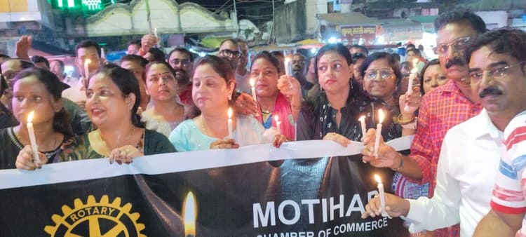 मोतिहारी.कोलकाता में महिला डॉक्टर के साथ हुए रेप व मर्डर कांड के आक्रोश में बुधवार को संयुक्त रुप से सामाजिक व व्यवसायिक संगठनों ने कैंडल मार्च निकाला. कैंडल मार्च ज्ञानबाबू चौक से चलकर मीना बाजार गांधी चौक पहुंचकर सभा में तब्दिल हो गया. इस अवसर पर सभी संगठनों के लोग दोषी को फांसी की सजा के साथ बंगाल सरकार को बर्खास्त करने की मांग कर रहे थे. कैंडल मार्च में लायंस क्लब कपल से अध्यक्ष चंदु मिश्रा व जोन चेयरपर्सन अंगद सिंह , ईस्ट चंपारण लायंस क्लब से रीजन चेयरमैन अमरनाथ साहू व जोन चेयर पर्सन सुजीत कुमार सिंह , चंदन कुमार,मोतिहारी लायंस क्लब से अध्यक्ष त्रिलोकी कुमार व पूर्व अध्यक्ष अरुण श्रीवास्तव, लियो क्लब से शुभम गुप्ता , रोटरी क्लब अध्यक्ष विवेक गौरव व डॉ आशुतोष , रोटरी लेक टाउन से अध्यक्ष रोहित गुप्ता व राहुल शर्मा, मोतिहारी चैंबर ऑफ कॉमर्स से अध्यक्ष राजीव विजडम व महासचिव सुनील कुमार, भारत विकास परिषद् से डॉ एसएन पटेल, स्वर्णकार संघ से अध्यक्ष धर्मेन्द्र कुमार व जिला महामंत्री सुधीर गुप्ता, बलुआ व्यवसायी संघ से अध्यक्ष शेखर कुमार, जानपुल व्यवसायी संघ से अजय कुमार व भरत प्रसाद , हिन्दी बाजार व्यवसायी संघ से राम भजन , मारवाड़ी युवा मंच, सिटीजन फोरम से कौशल किशोर सिंह व अजय आजाद, इनर व्हृील से अध्यक्ष पुतुल सिंह सहित अन्य संगठनों के सैकड़ों लोग शामिल थे. जुलूस में भारी संख्या में पुरुष व महिलाओं की संख्या थी.